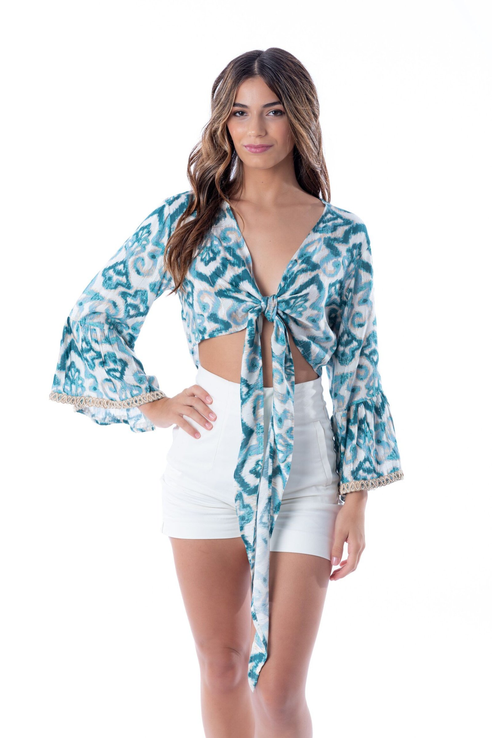 Blusa de mangas amplias y corte moderno. Las largas solapas para anudar a la cintura hacen de esta prenda la expresión perfecta del estilo boho. Las variantes son en tejido viscosse con lurex y en algodon bordado.