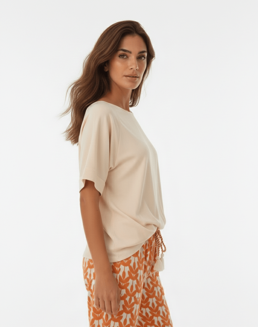 Blusa mangas raglan corta de diseño moderno, clásico y versátil. Diseñada en Mallorca fabricada en India. Composición 100% Viscosa Satén