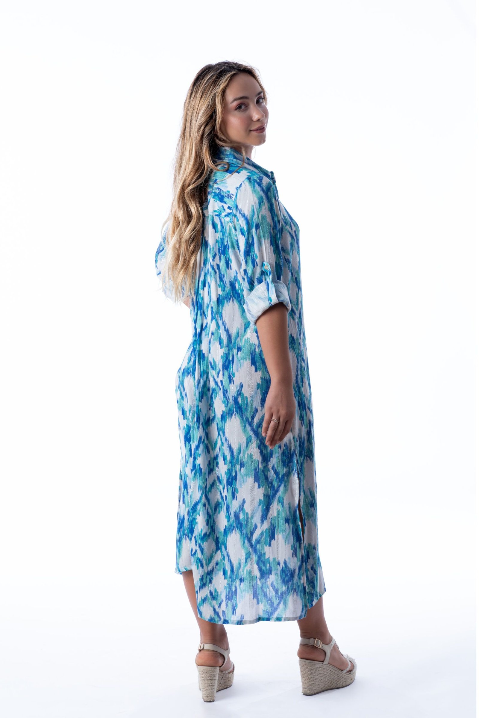 El exclusivo estampado IKAT y el tejido de Viscose con hilos plata de Lurex, convergen en la confección del vestido camisero abotonado de largo midi. De tacto suave presenta una silueta sencilla y fluida que aporta un estilo relajado.