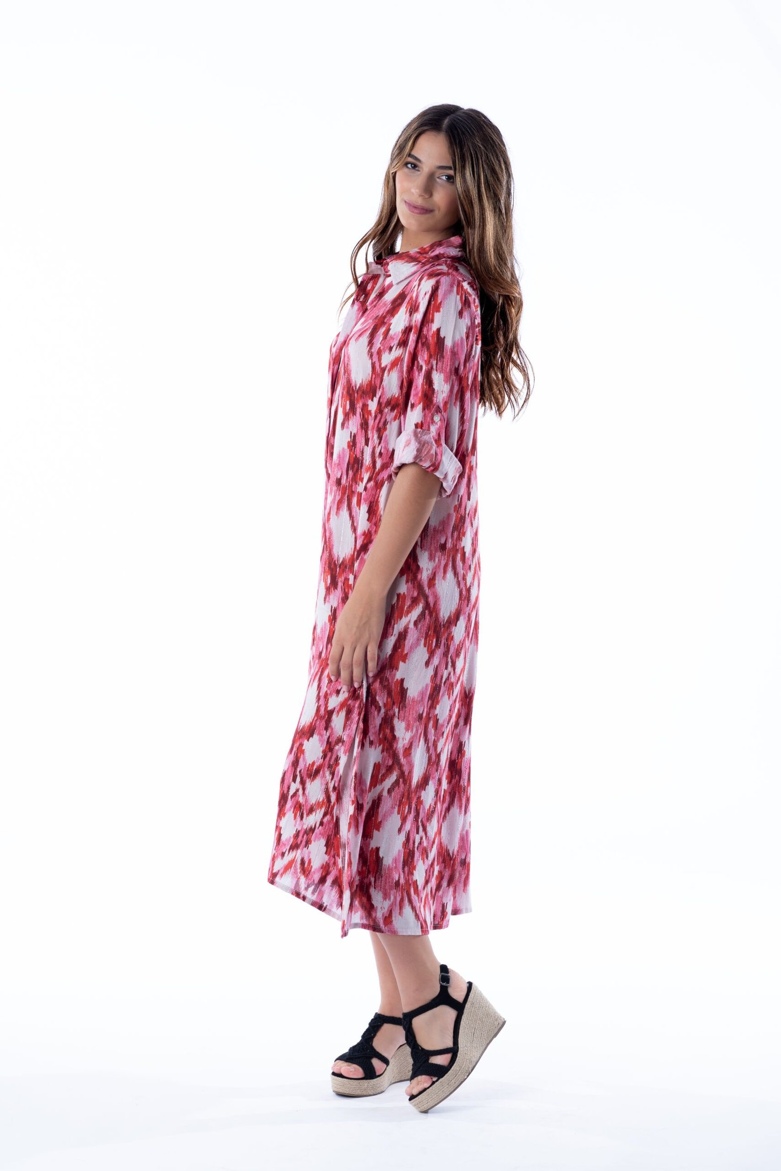El exclusivo estampado IKAT y el tejido de Viscose con hilos plata de Lurex, convergen en la confección del vestido camisero abotonado de largo midi. De tacto suave presenta una silueta sencilla y fluida que aporta un estilo relajado.