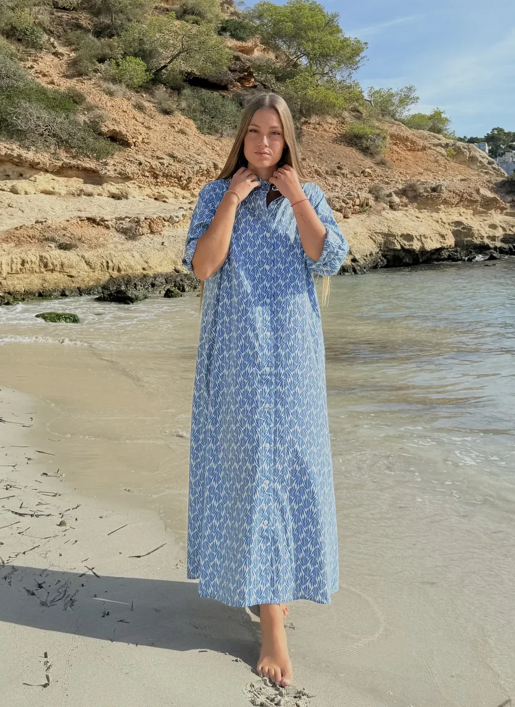 Vestido camisero largo de silueta fluida. Confeccionado en diversos tejidos nobles, muy suaves y transpirables. Las mangas largas con trabilla para recoger lo que le aporta versatilidad para los calurosos días de verano. Diseñado en Mallorca fabricado en India. Composición 100% Algodón