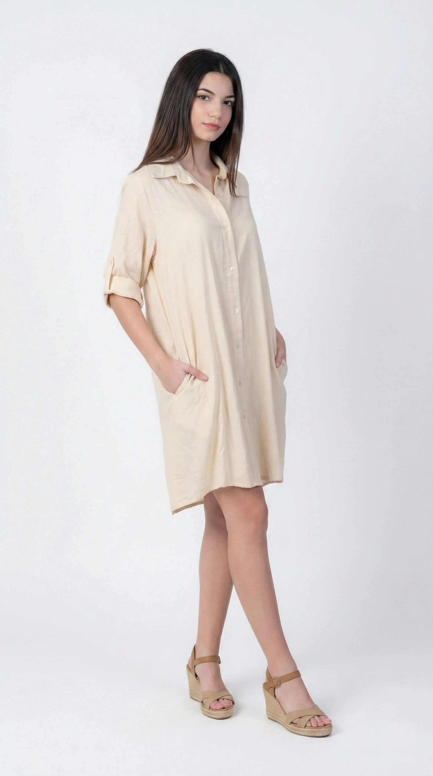 Vestido camisero corto con mangas largas con trabillas para recoger. Confeccionado en tejido ligero muy suave y transpirable. La silueta es sencilla, relajada y fresca. Para usar solo, como sobre camisa o combinarlo con tejanos. Un clásico que no puede faltar en tu guardaropa. Diseñado en Mallorca fabricado en India. Composición 100% Algodón