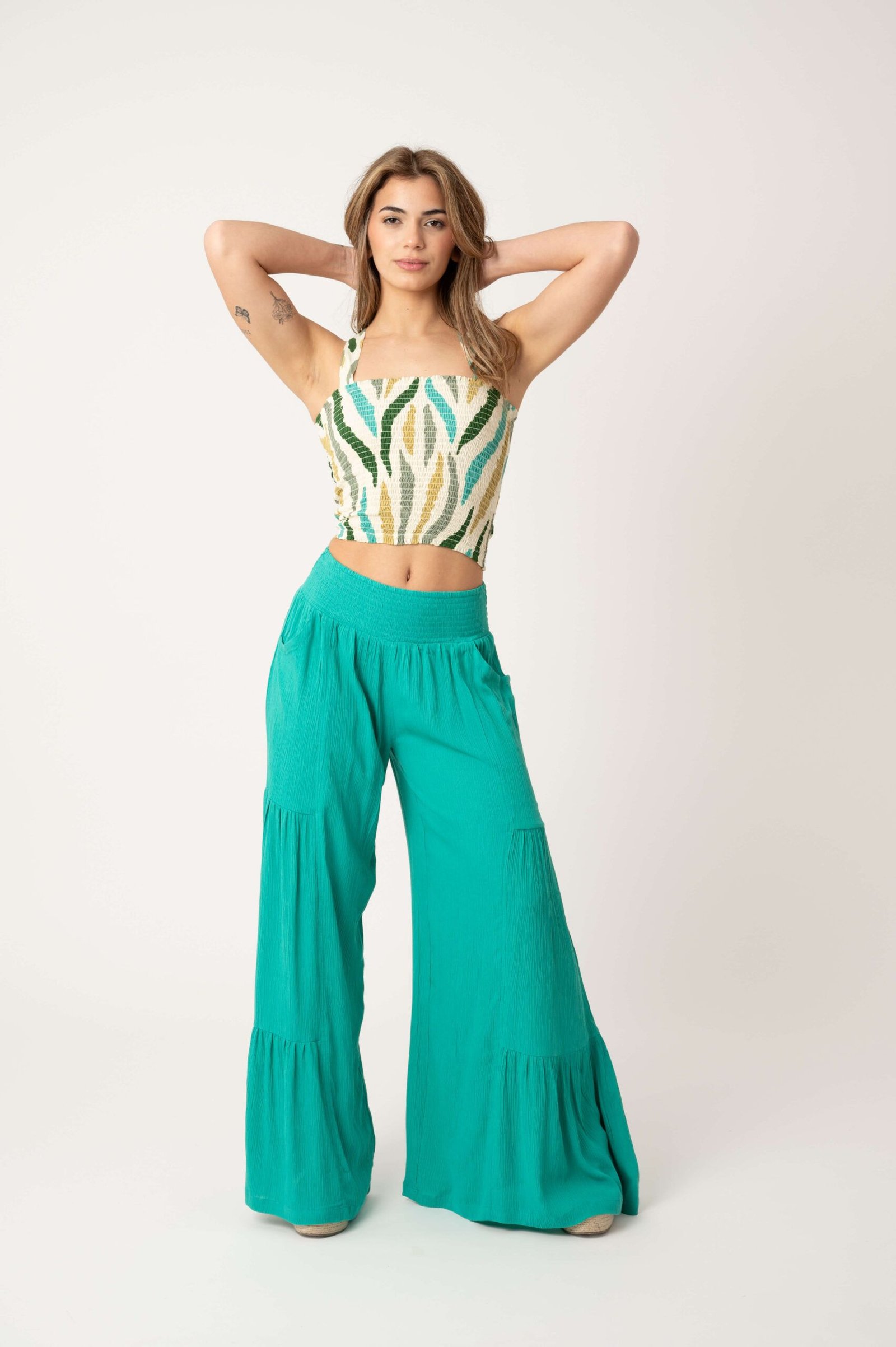 La elegancia del pantalón Muss con los estampados inspirados en la combinación del mar y la arena y las rojizas puestas del sol Mediterráneo, transmiten una sensación de encanto atemporal. Confeccionado en tejido Viscose 100 % de maxima calidad, garantizan un ajuste favorecedor. La silueta de pierna ancha y la cintura elástica añaden comodidad y un toque femenino. Es el pantalón, perfecto para ocasiones informales o elegantes con estilo sutil.