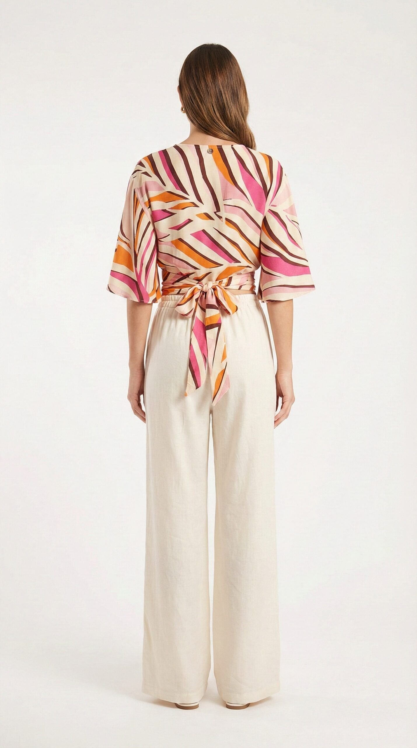 Pantalón largo tiro medio. Cintura elástica ajustable con cordones torsados artesanales. Bolsillos en los laterales. Pernera recta y ancha. Diseñado en Mallorca fabricado en India. Composición 100% Algodón