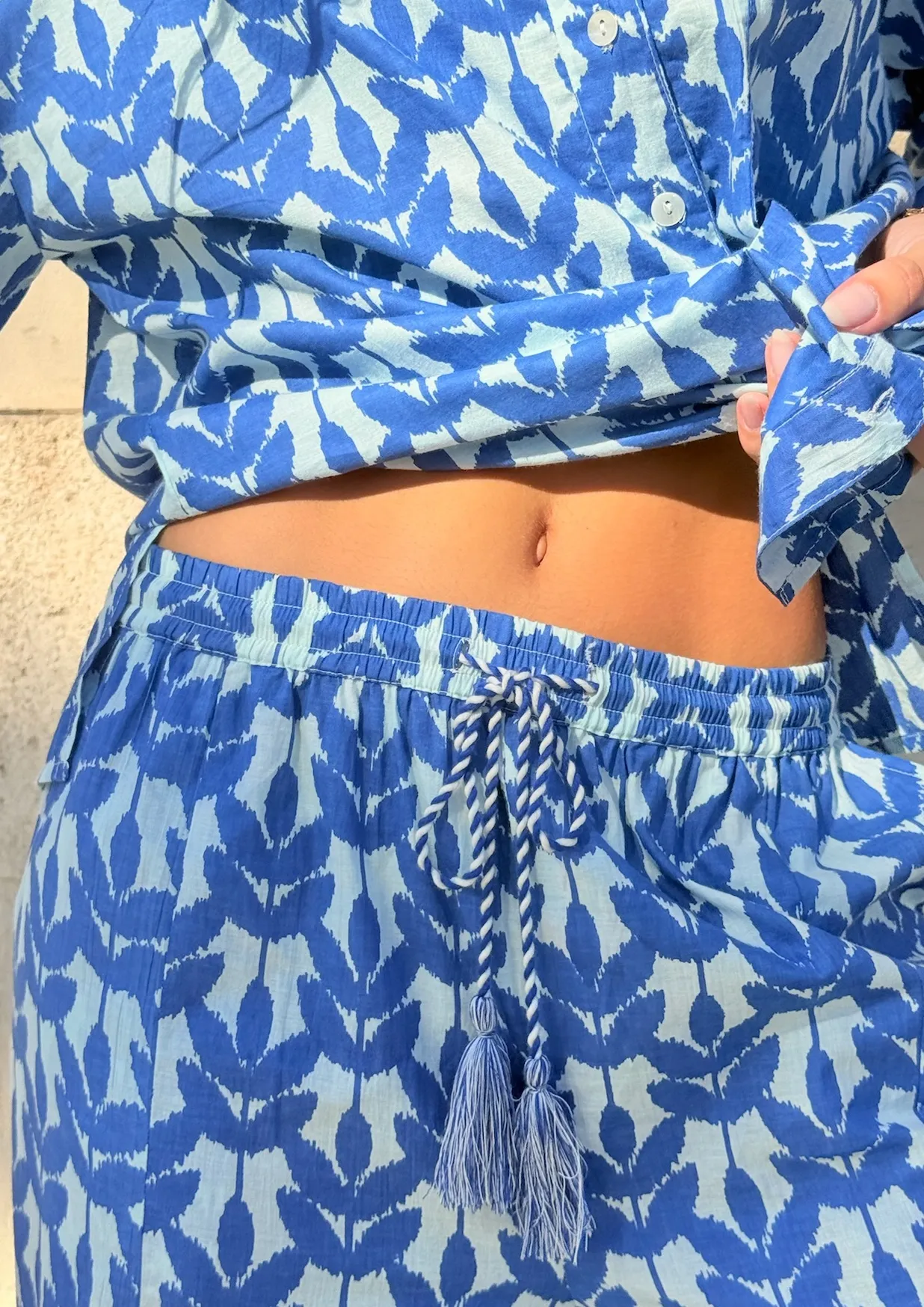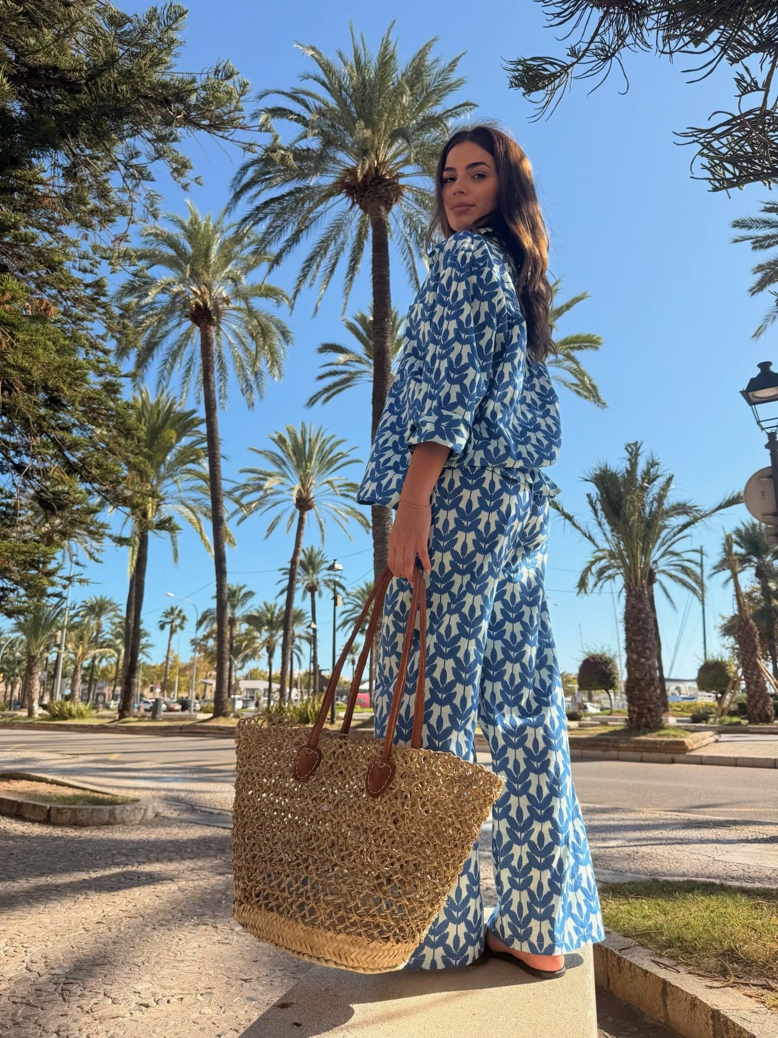 Pantalón largo tiro medio. Cintura elástica ajustable con cordones torsados artesanales. Bolsillos en los laterales. Pernera recta y ancha. Diseñado en Mallorca fabricado en India. Composición 100% Algodón