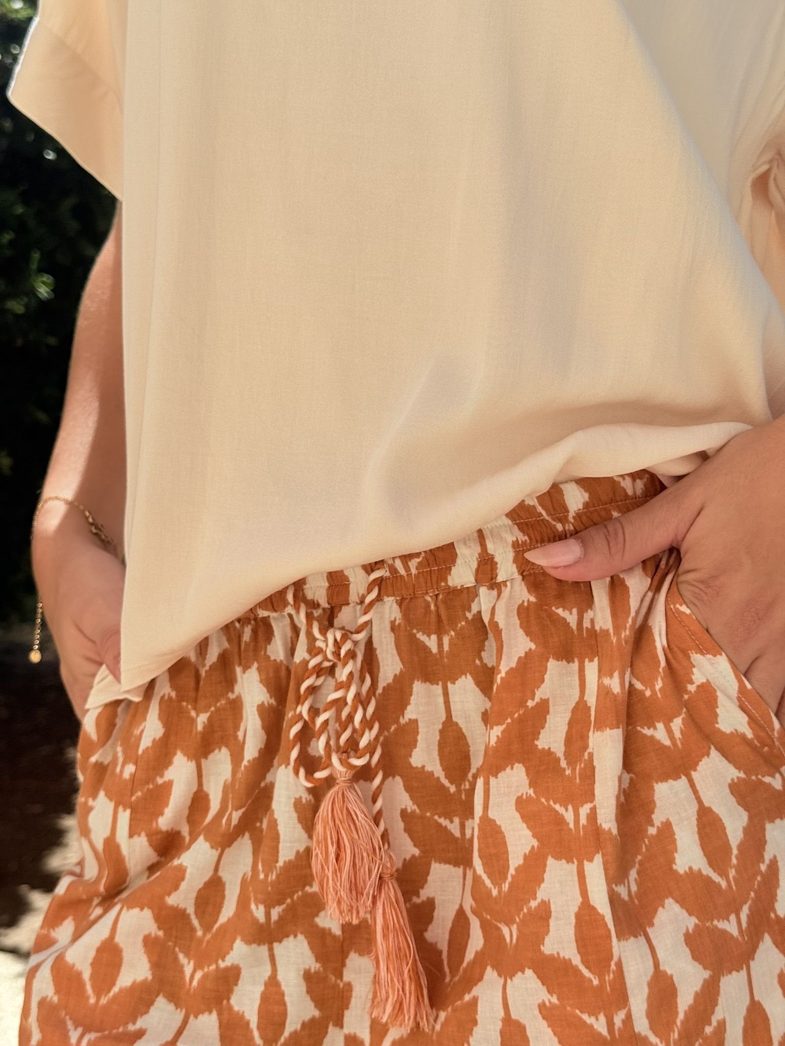 Pantalón largo tiro medio. Cintura elástica ajustable con cordones torsados artesanales. Bolsillos en los laterales. Pernera recta y ancha. Diseñado en Mallorca fabricado en India. Composición 100% Algodón