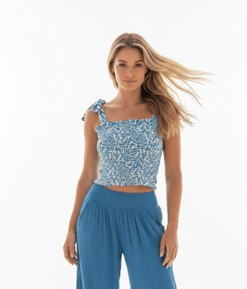 El color azul, estratégico por su versatilidad y atractivo universal, complementa a la perfección el audaz estampado, resultando en una pieza imprescindible. Es un elemento clave para cualquier surtido de moda femenina mayorista de cara a la colección primavera verano, no solo por su impacto visual en el escaparate, sino por el margen atractivo que ofrece.