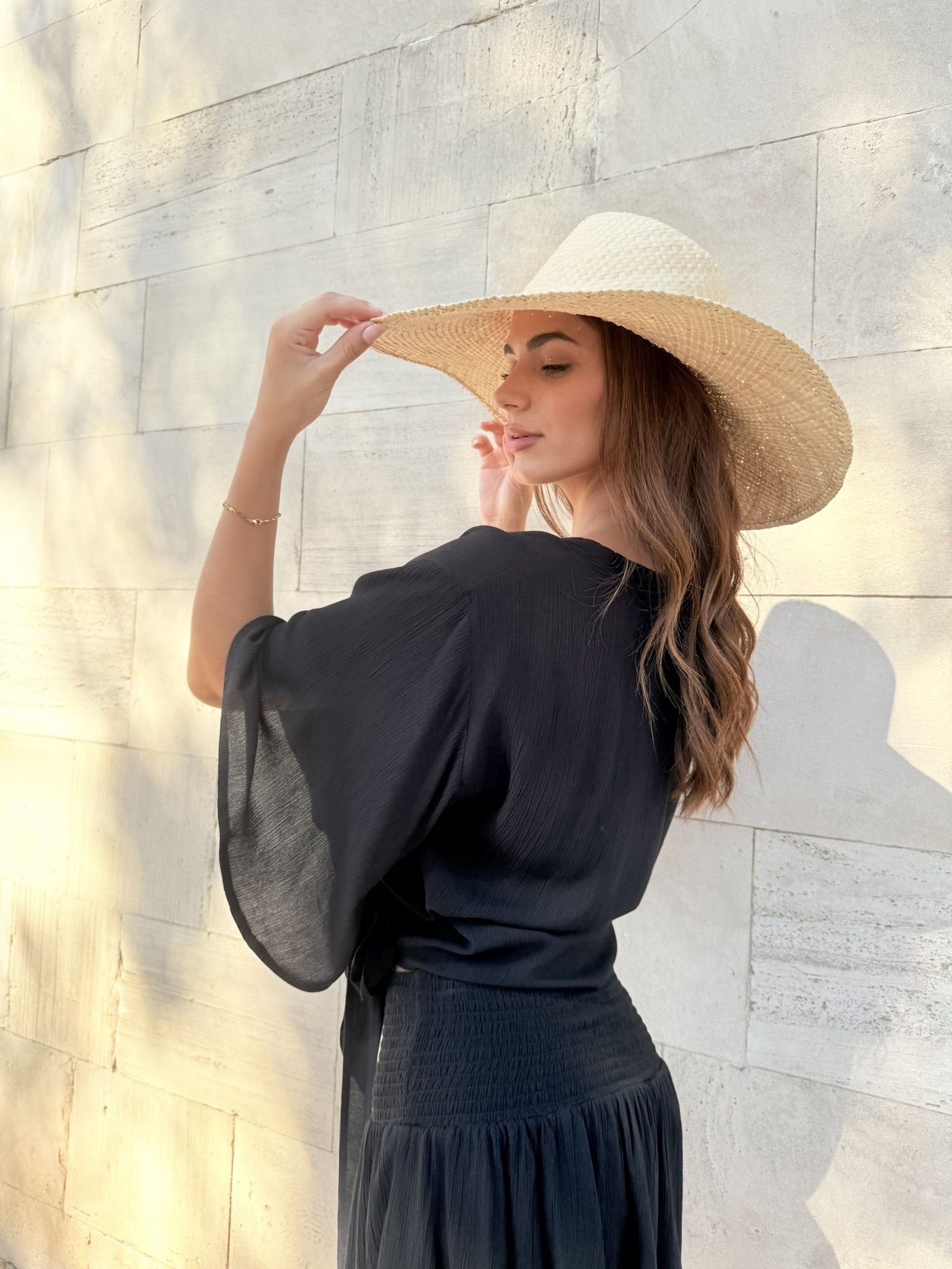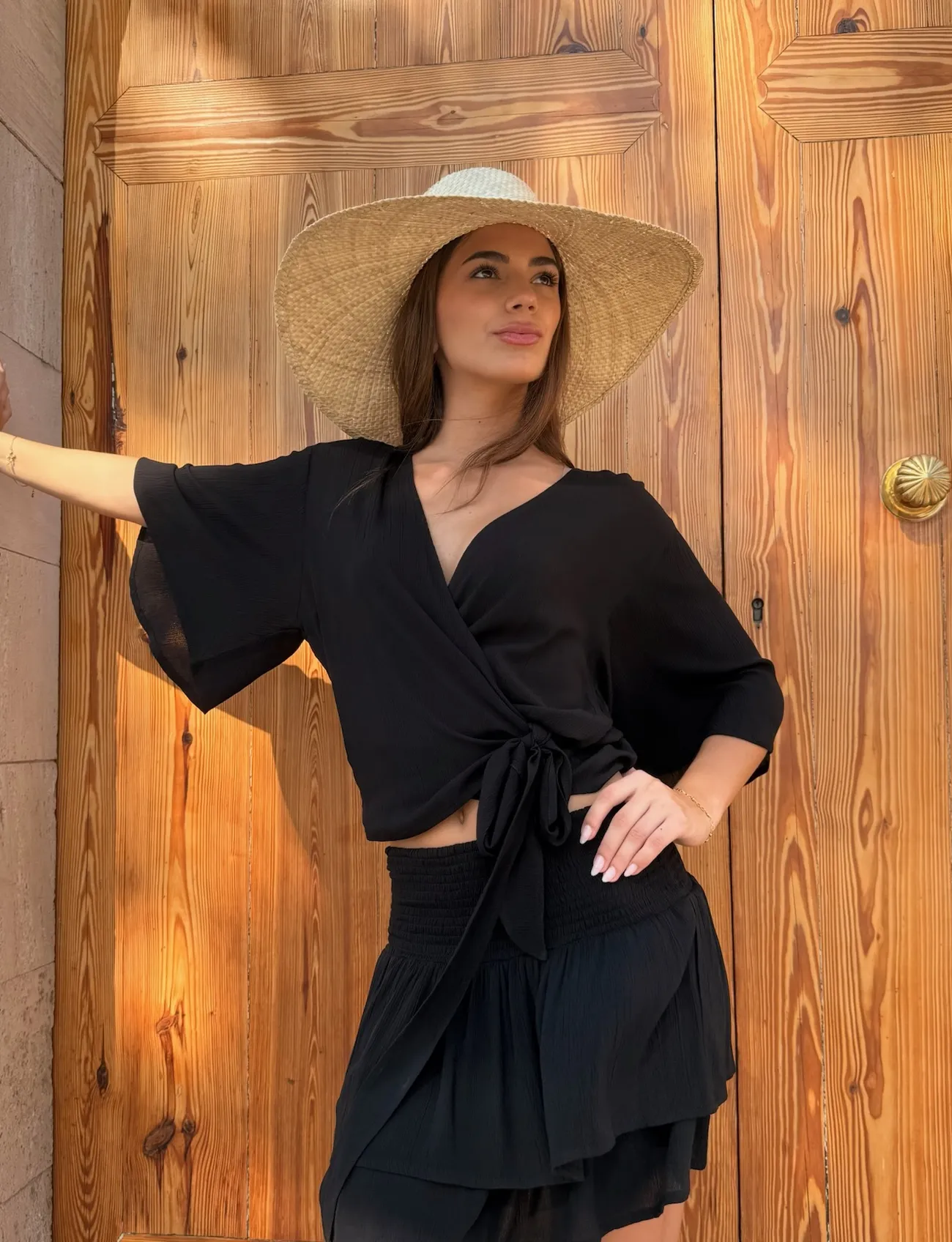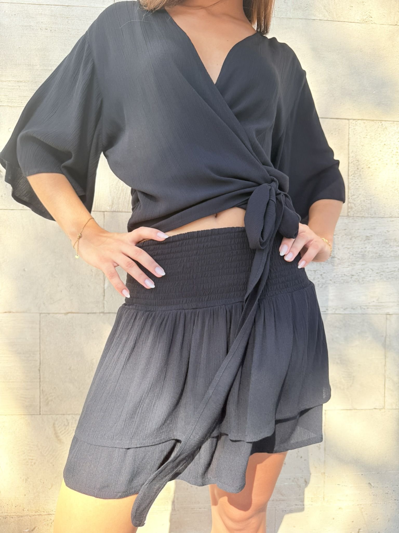 Top de mangas amplias y corte moderno. Las largas solapas para anudar a la cintura hacen de esta prenda la expresión perfecta del estilo boho. Diseñano en Mallorca fabricado en India. Composición 100% Viscosa Crepe