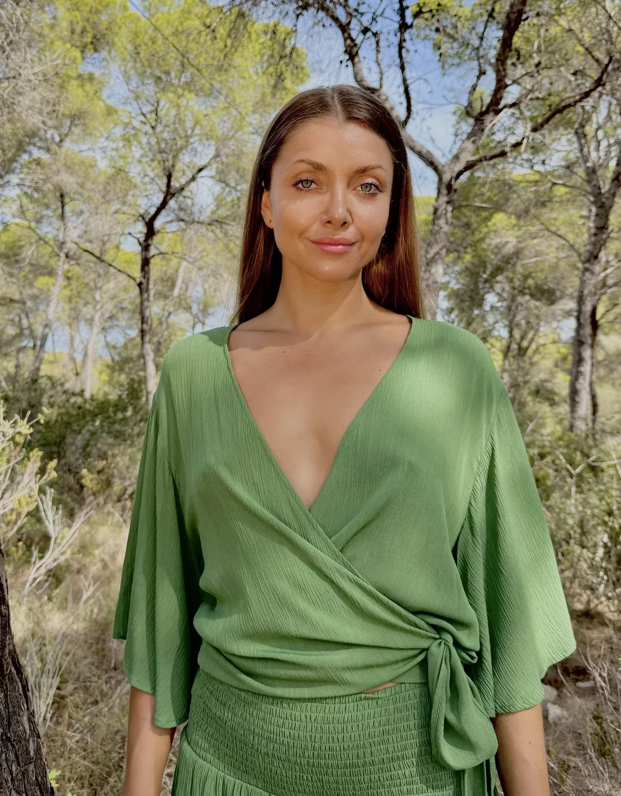 Este Top Olga Green se posiciona como una pieza clave dentro de la colección primavera verano, encapsulando a la perfección el estilo boho chic tan buscado. Con sus mangas amplias y un corte moderno y ligeramente corto, aporta un toque fresco y desenfadado que atrae todas las miradas. Las elegantes solapas largas para anudar a la cintura permiten una silueta ajustable y versátil, realzando la figura de forma sutil y ofreciendo múltiples posibilidades de estilo.