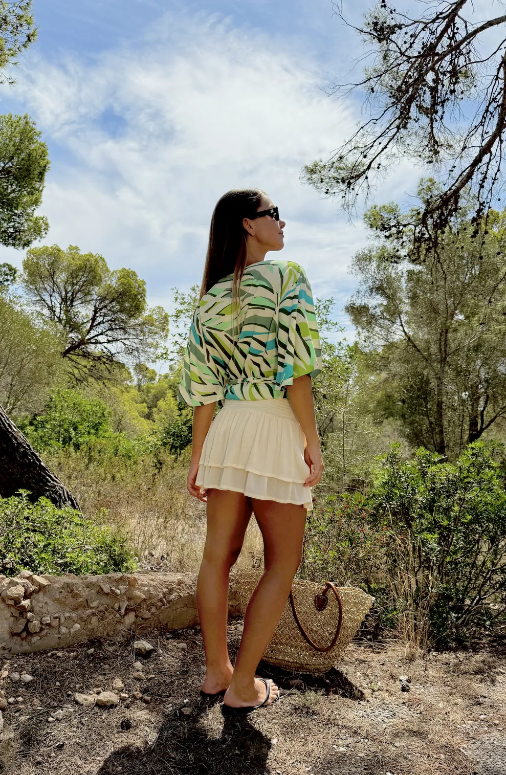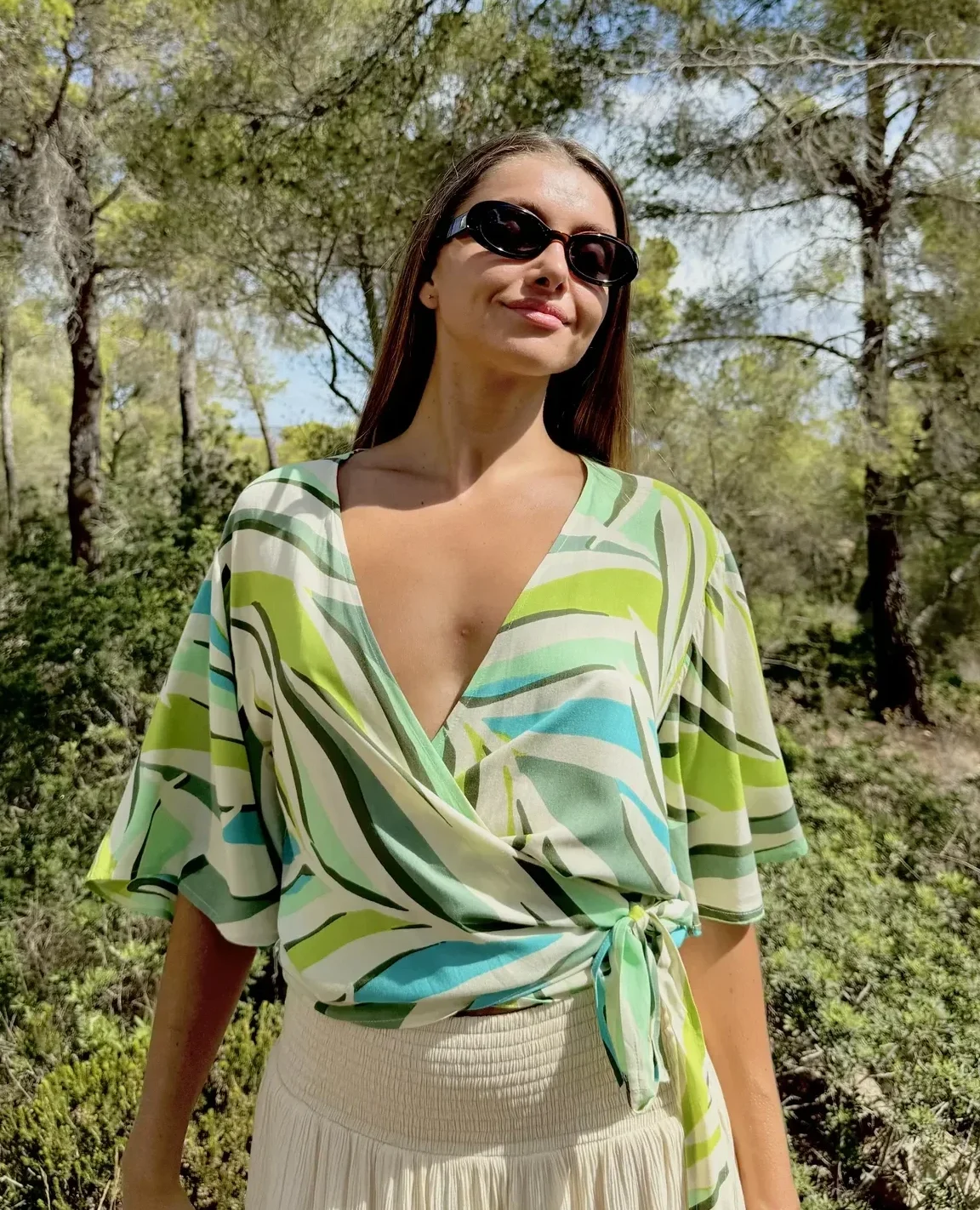 Top de mangas amplias y corte moderno. Las largas solapas para anudar a la cintura hacen de esta prenda la expresión perfecta del estilo boho. Diseñano en Mallorca fabricado en India. Composición 100% Viscosa