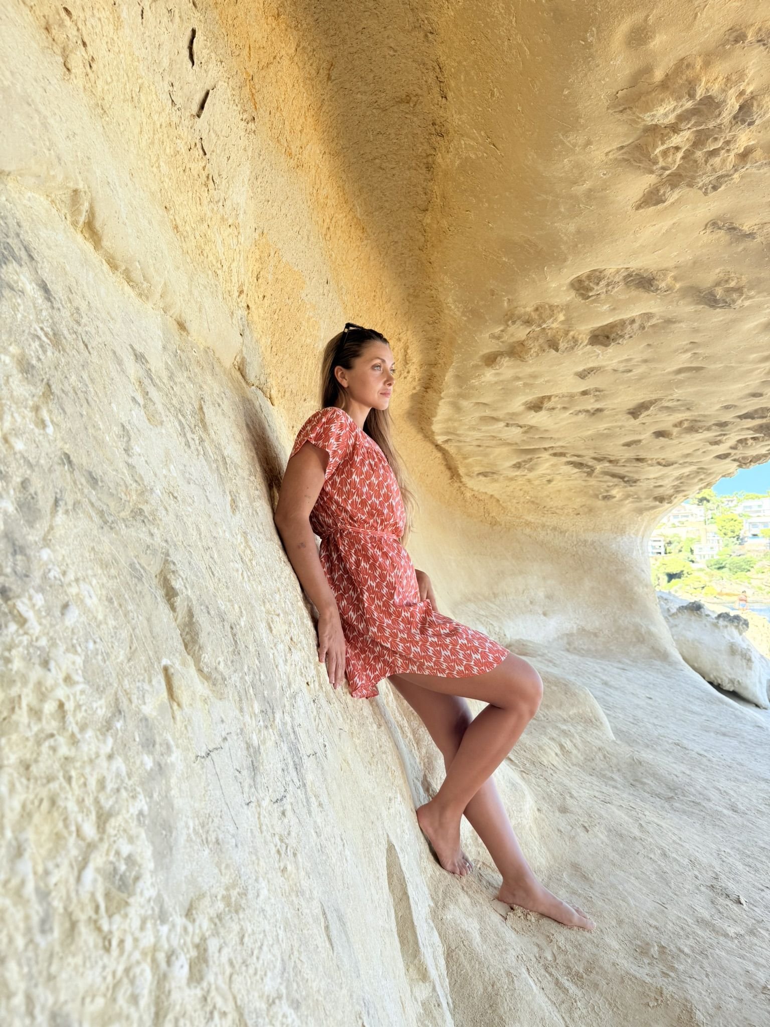 Vestido corto mangas cortas de estilo fluido y largo irregular con cinturon, escote «V» y bolsillos laterales. De corte amplio esta túnica ofrece comodidad y estilo. Diseñado en Mallorca fabricado en India. Composición 100% Algodón