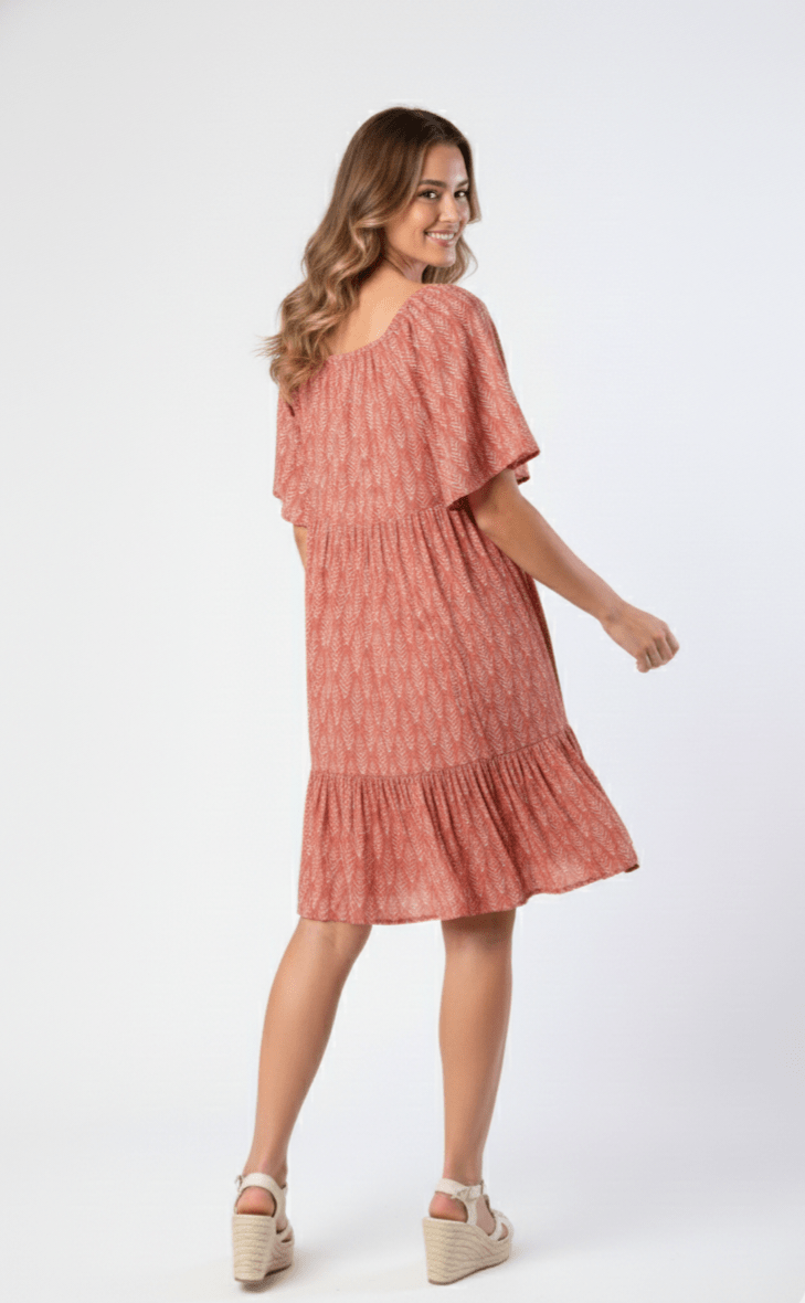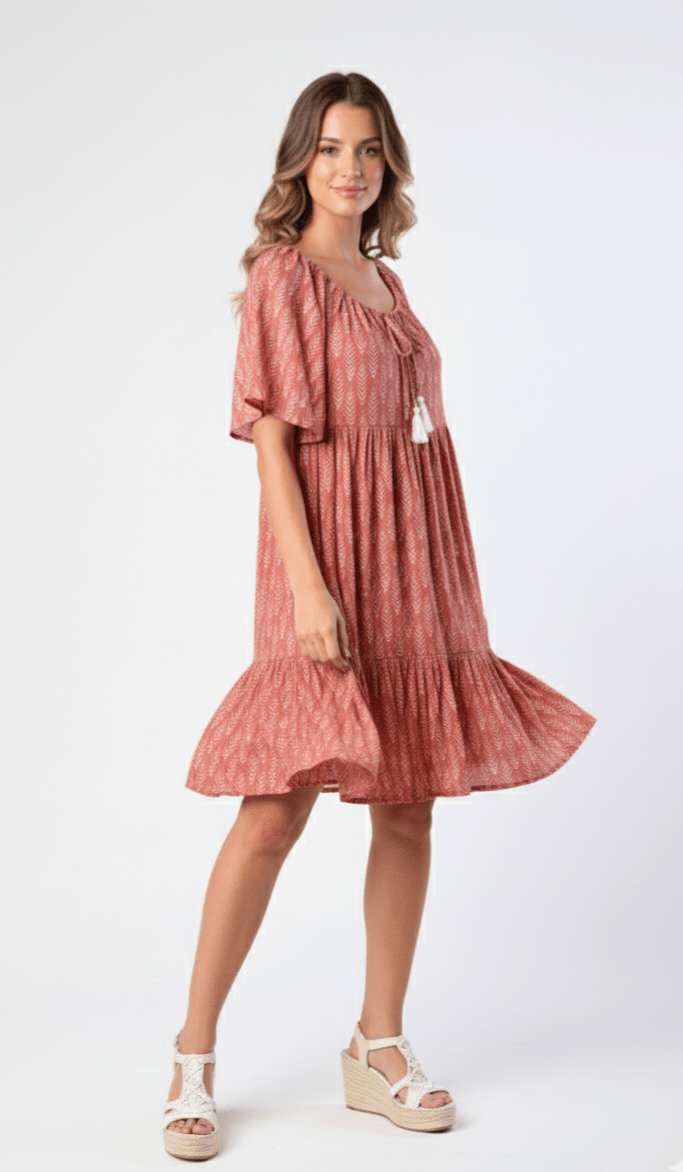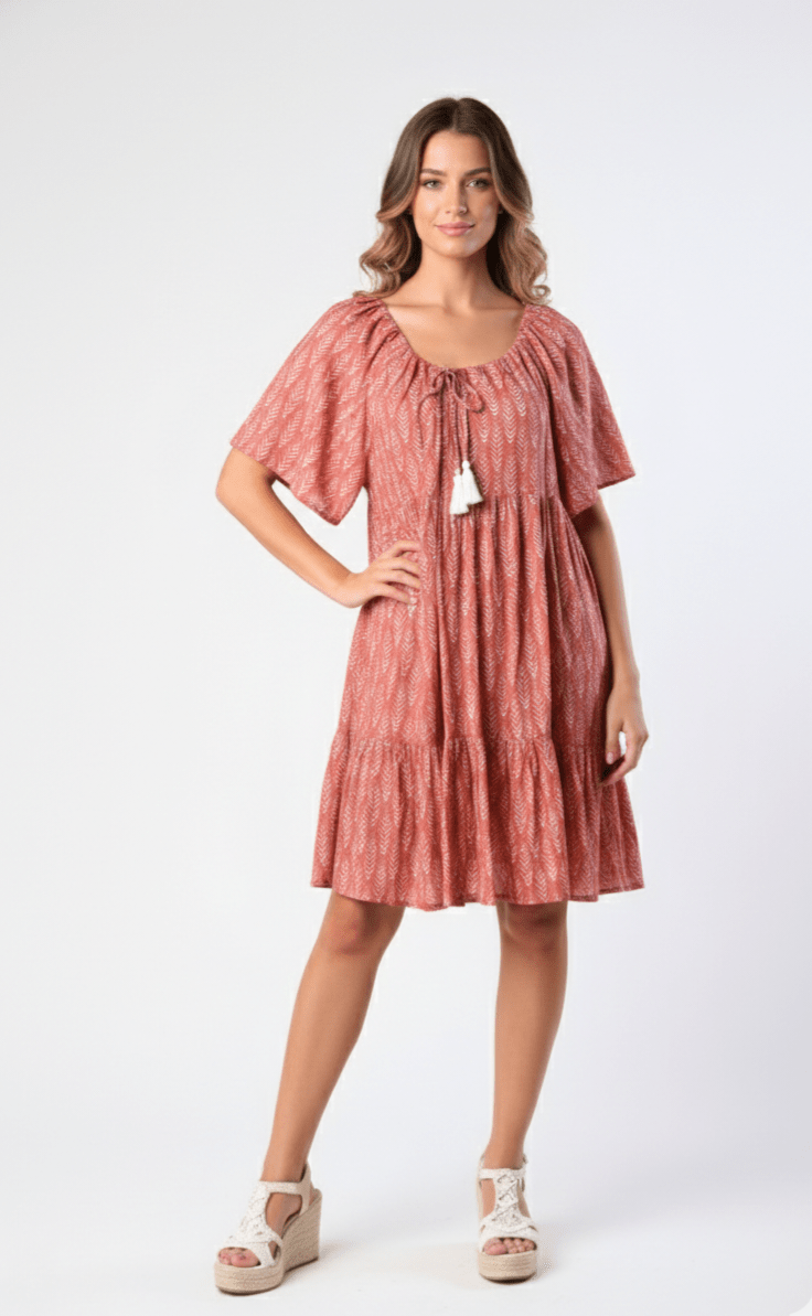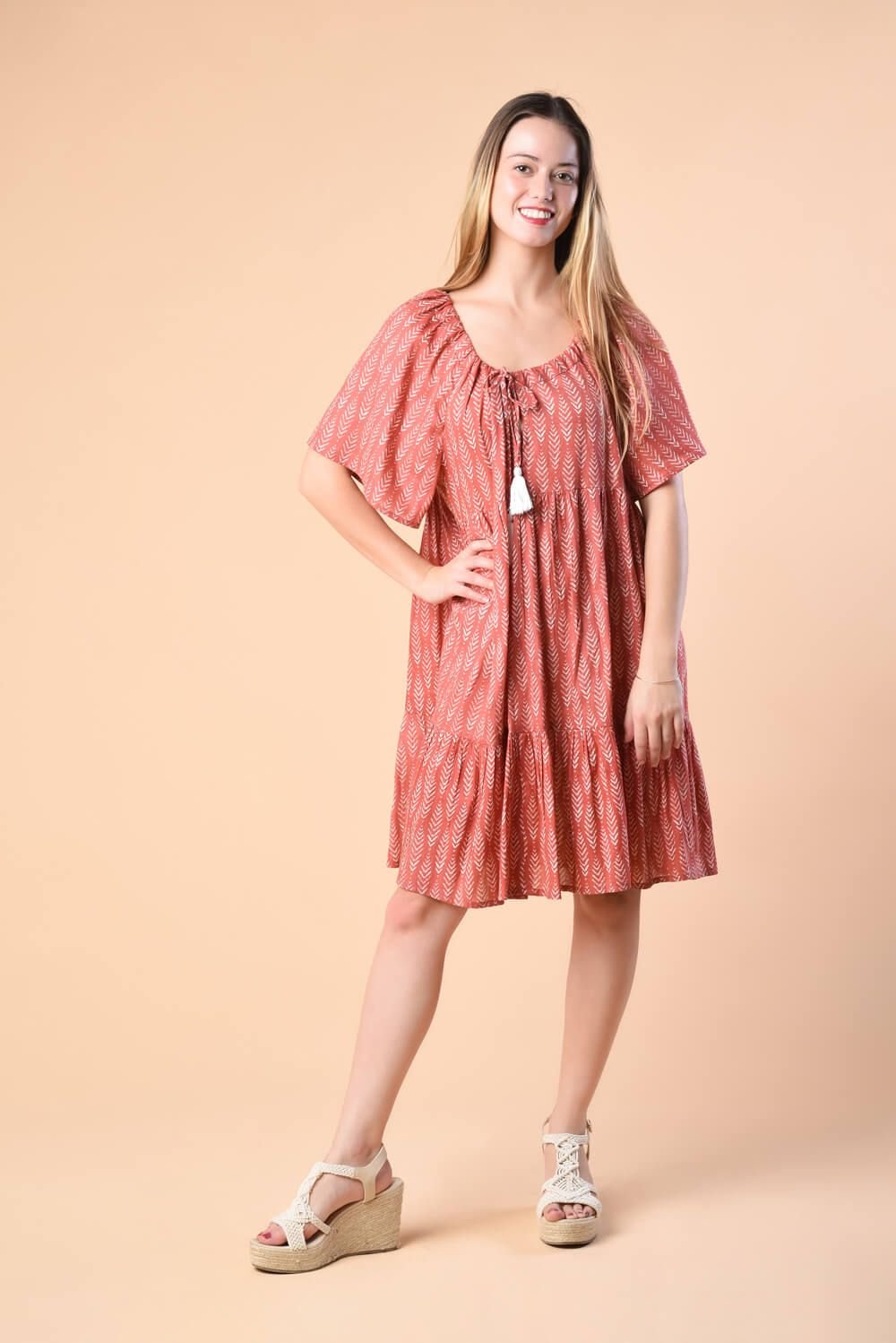 Lucia vestido corto fluido con volante. manga corta. escote redondo ajustable con cordon