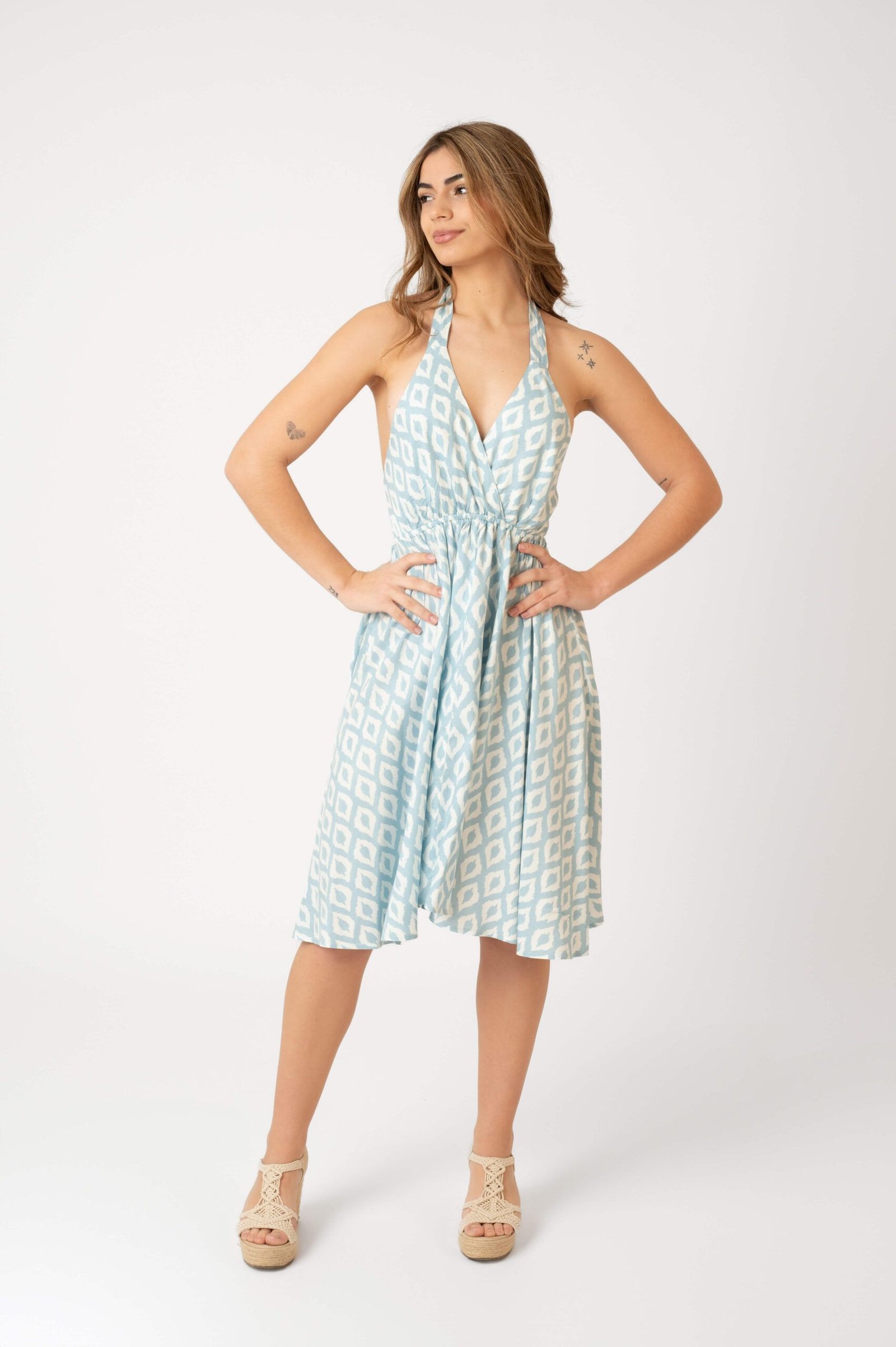 Vestido de diseño halter con escote en V, espalda descubierta y lazo ajustable para obtener una figura perfecta con aire seductor. El corte fluido y ligero, es ideal para mantener la frescura y comodidad en días cálidos.