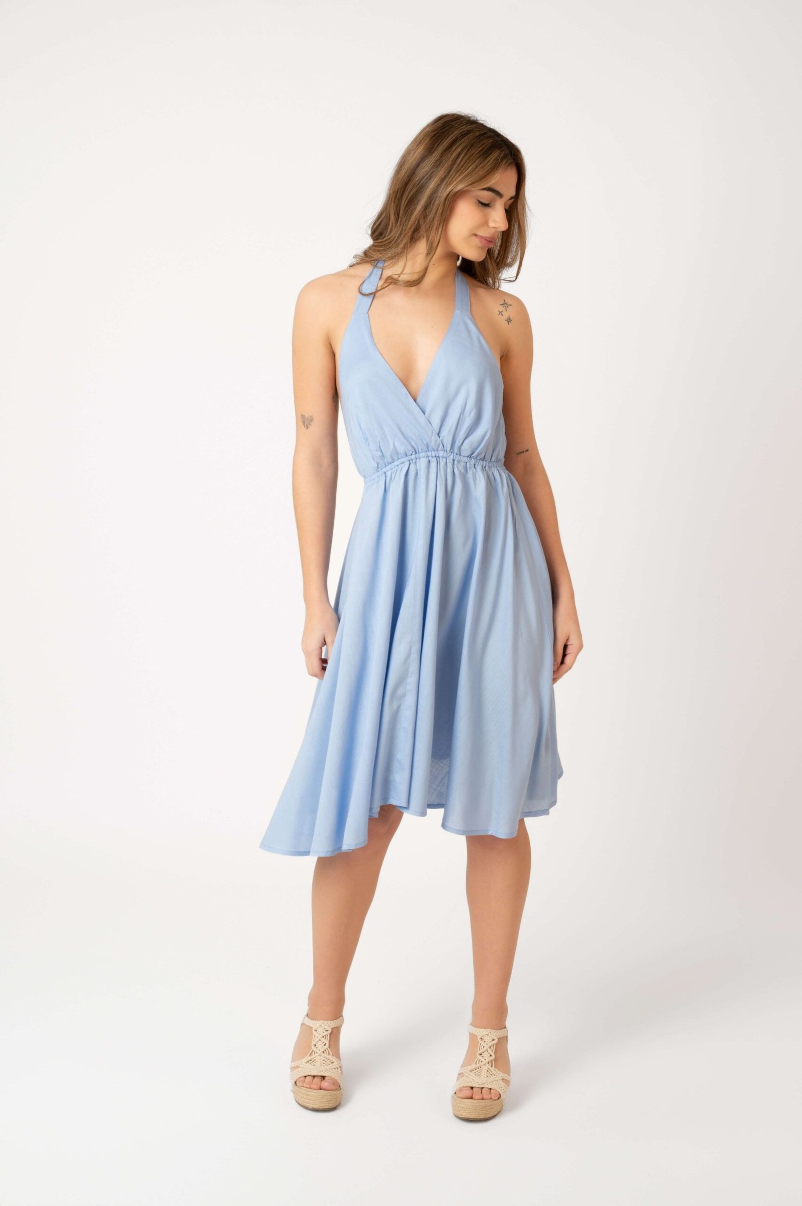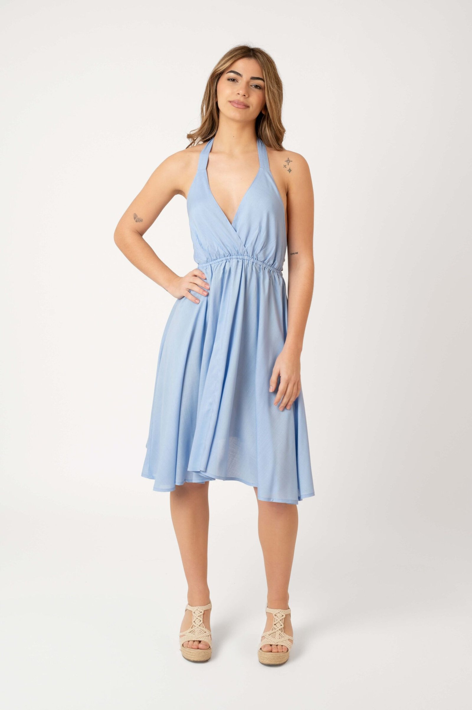 Vestido de diseño halter con escote en V, espalda descubierta y lazo ajustable para obtener una figura perfecta con aire seductor. El corte fluido y ligero, es ideal para mantener la frescura y comodidad en días cálidos.
