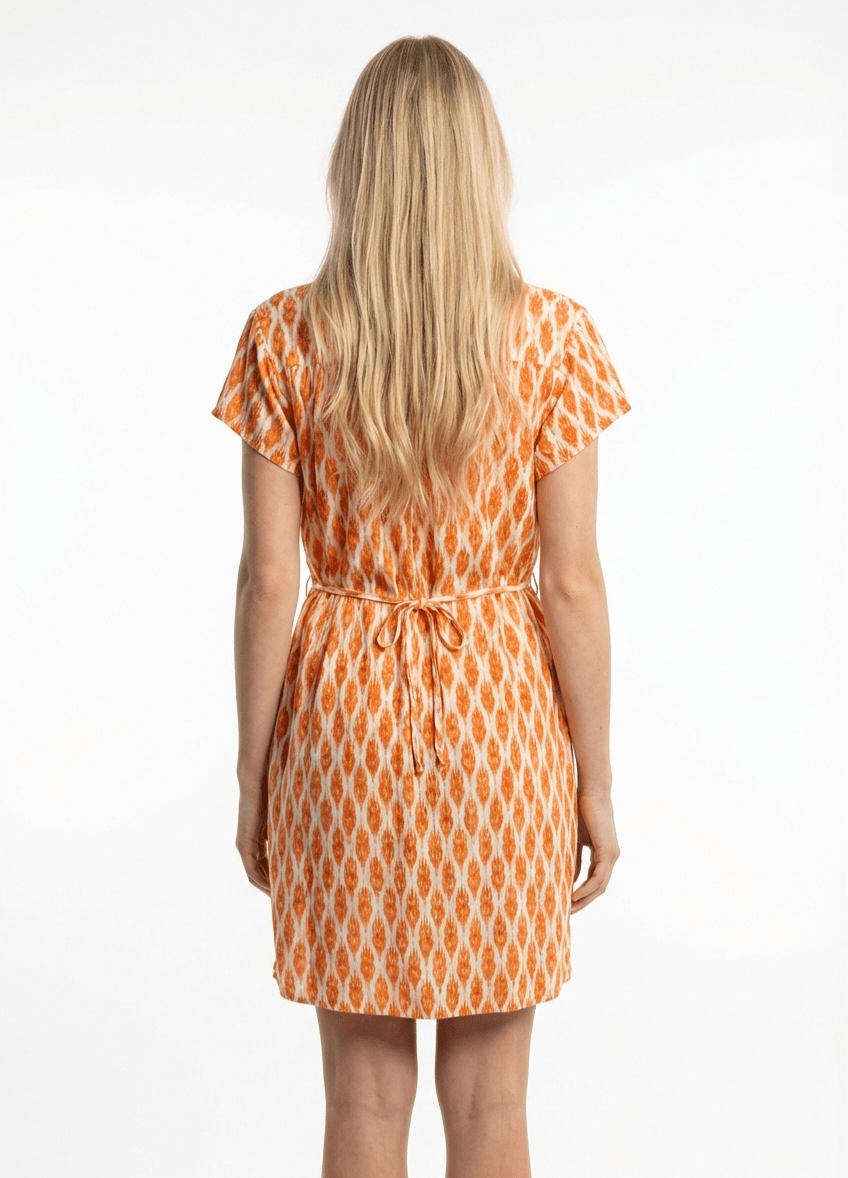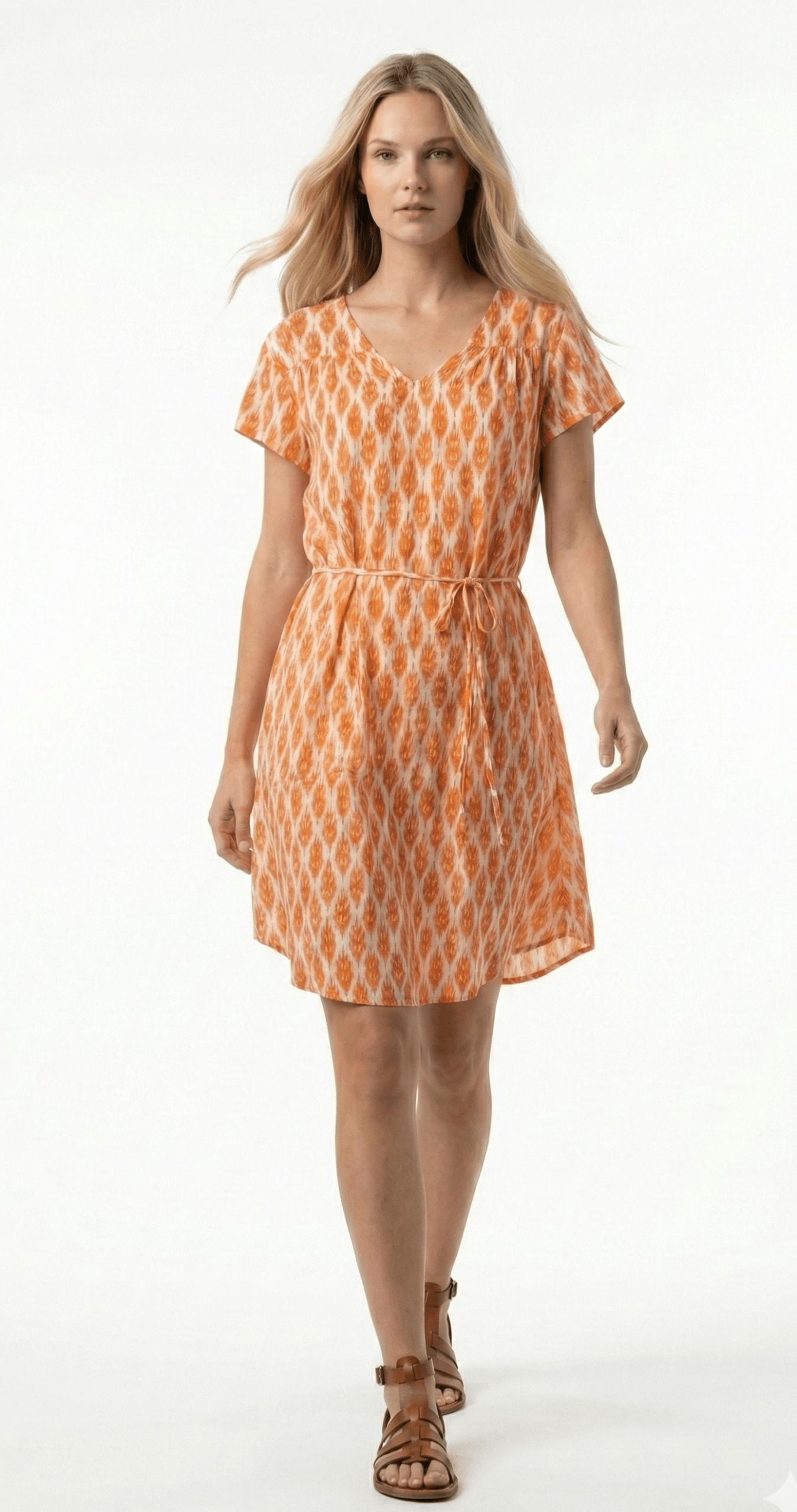 Vestido corto mangas cortas de estilo fluido y largo irregular con cinturon, escote «V» y bolsillos laterales. De corte amplio esta túnica ofrece comodidad y estilo. Diseñado en Mallorca fabricado en India. Composición 100% Algodón