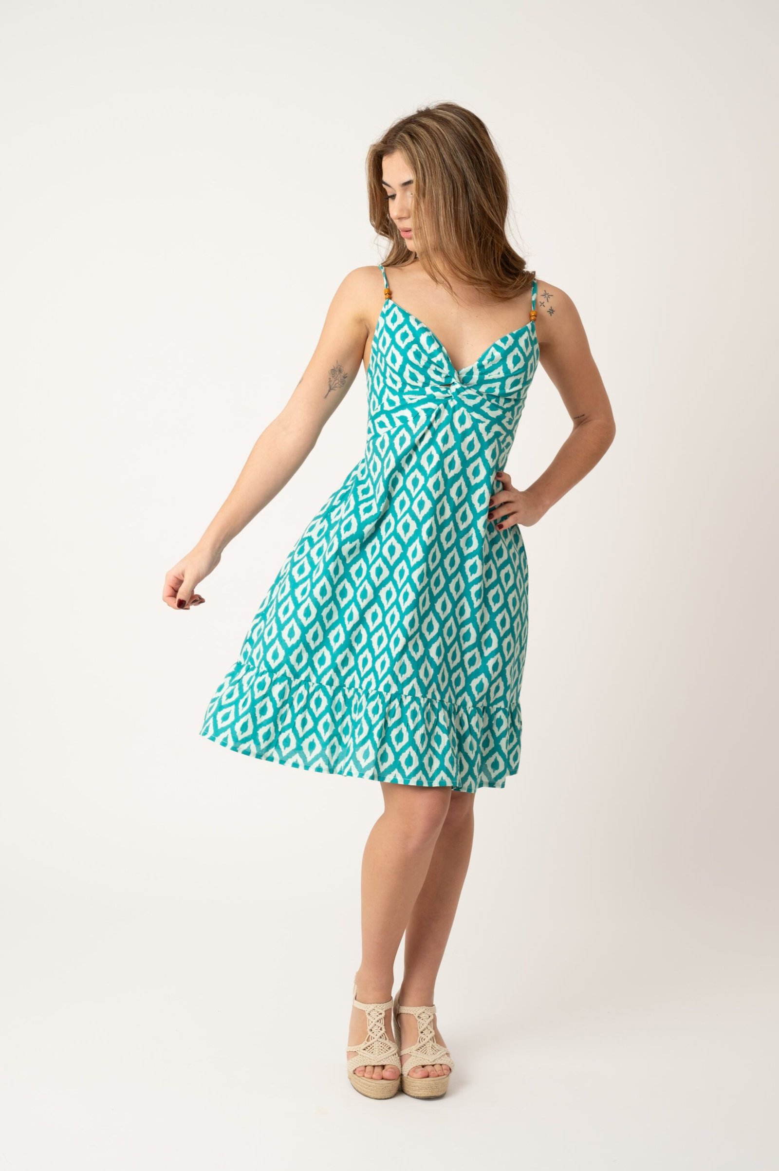 El vestido ROSE de finos tirantes y panel de busto entrelazado realza el estilo veraniego. El corte fluido y los tirantes regulables con detalle de borlas de madera le aportan un toque rustico y descontracturado para mantener la frescura y lucir moderna y cómoda sin esfuerzo.