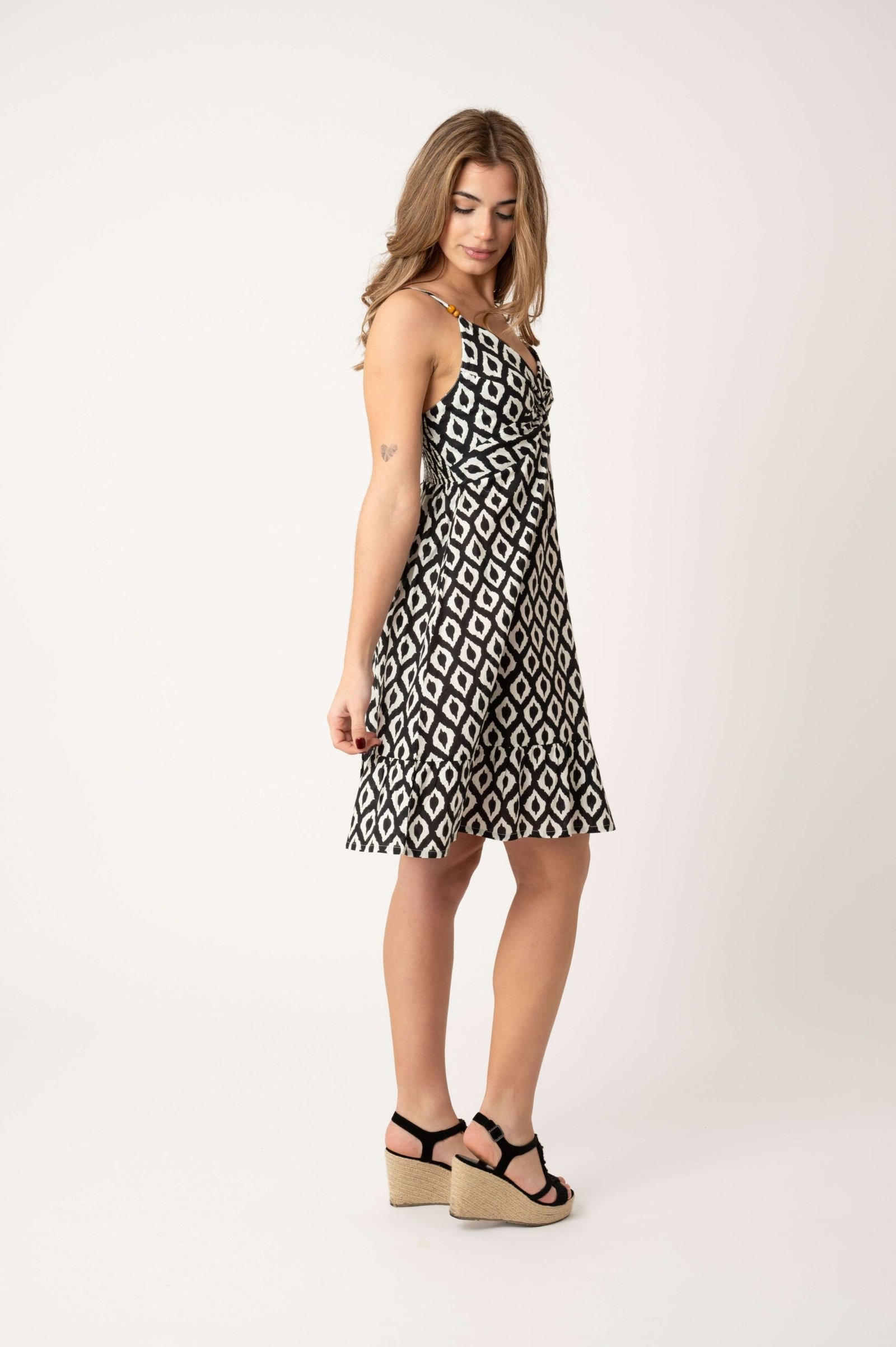 El vestido ROSE de finos tirantes y panel de busto entrelazado realza el estilo veraniego. El corte fluido y los tirantes regulables con detalle de borlas de madera le aportan un toque rustico y descontracturado para mantener la frescura y lucir moderna y cómoda sin esfuerzo.