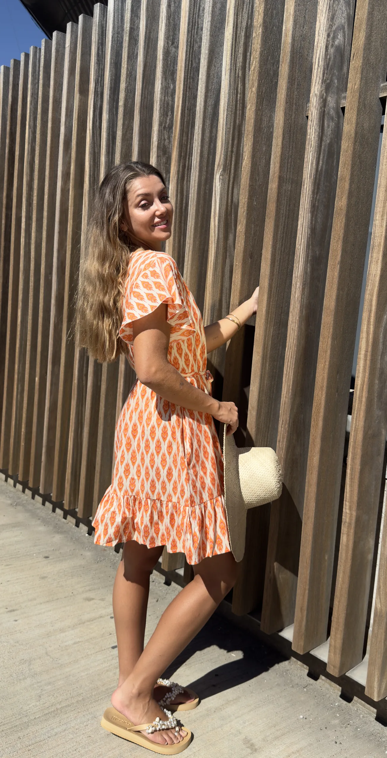 Sunrise vestido corto con mangas cortas fluidas escote «v» abotonado en el frente, bolsillos laterales y cinturon