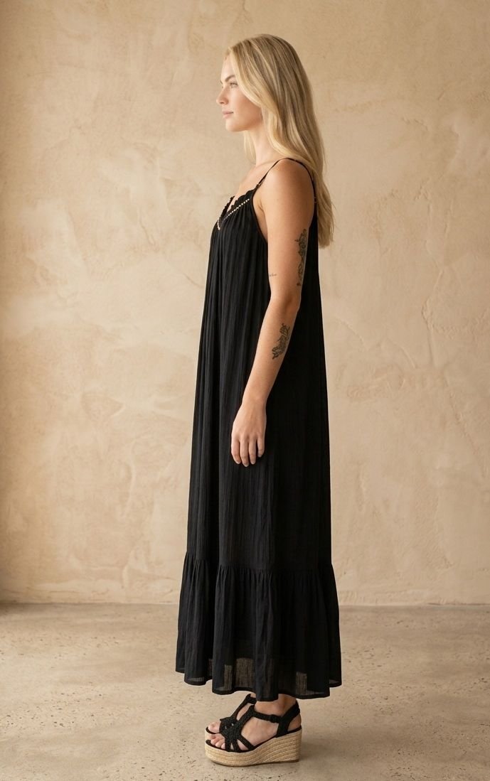 El Vestido Largo África Black captura miradas con una caída exquisita y una silueta que celebra la gracia natural. Confeccionado en suave viscosa crepe, este vestido fluido ofrece un movimiento ligero y elegante que se adapta a cada paso. Su diseño impecable realza la figura sin renunciar a la comodidad, una pieza esencial que irradia sofisticación para
