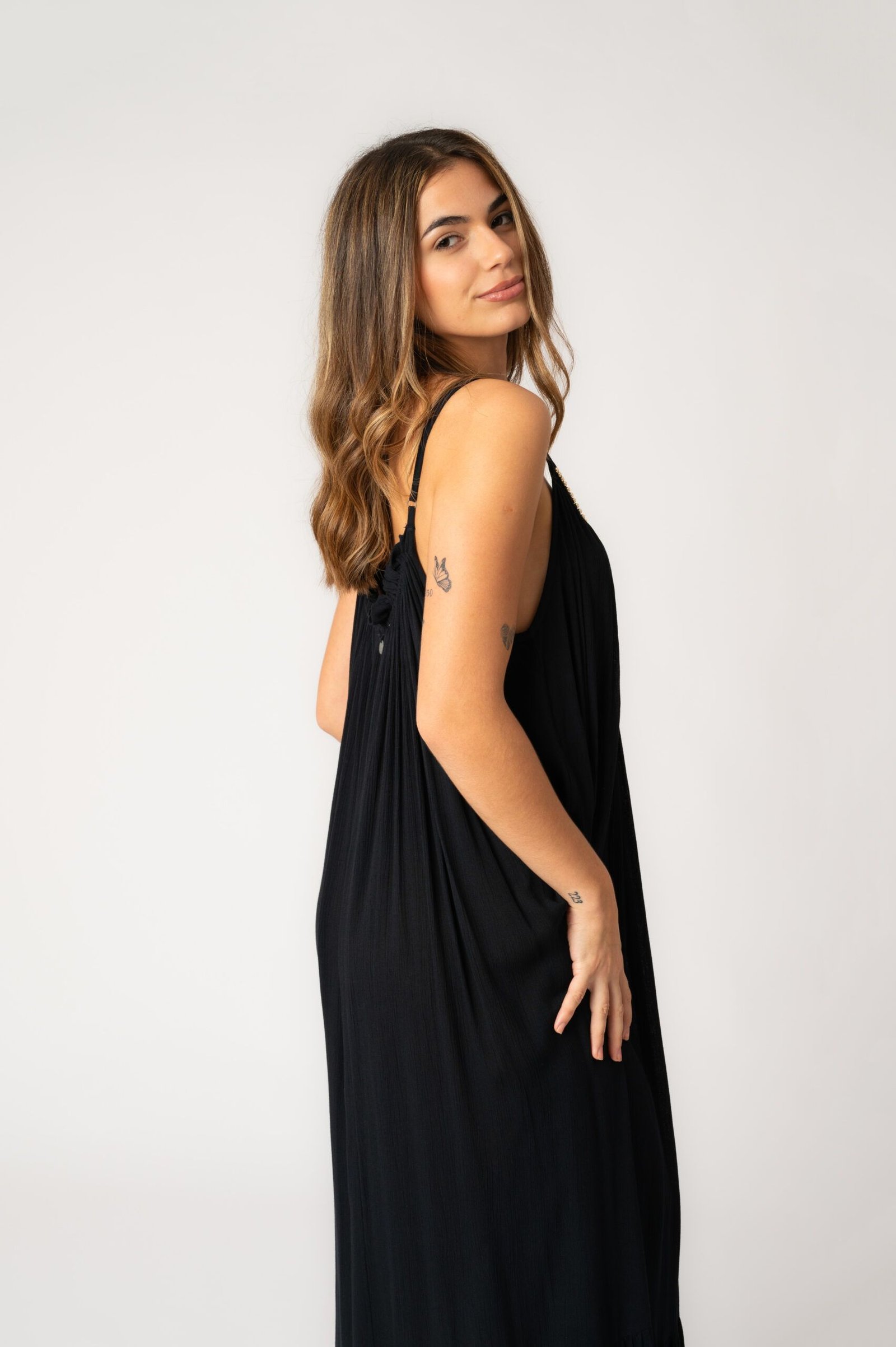 El maxivestido Africa es una sinfonía relajante. Con tirantes ajustables, bajo con volantes y detalle de embellishment en el cuello ofrece una silueta muy relajada que lo convierten en el básico perfecto para el día a día en verano.