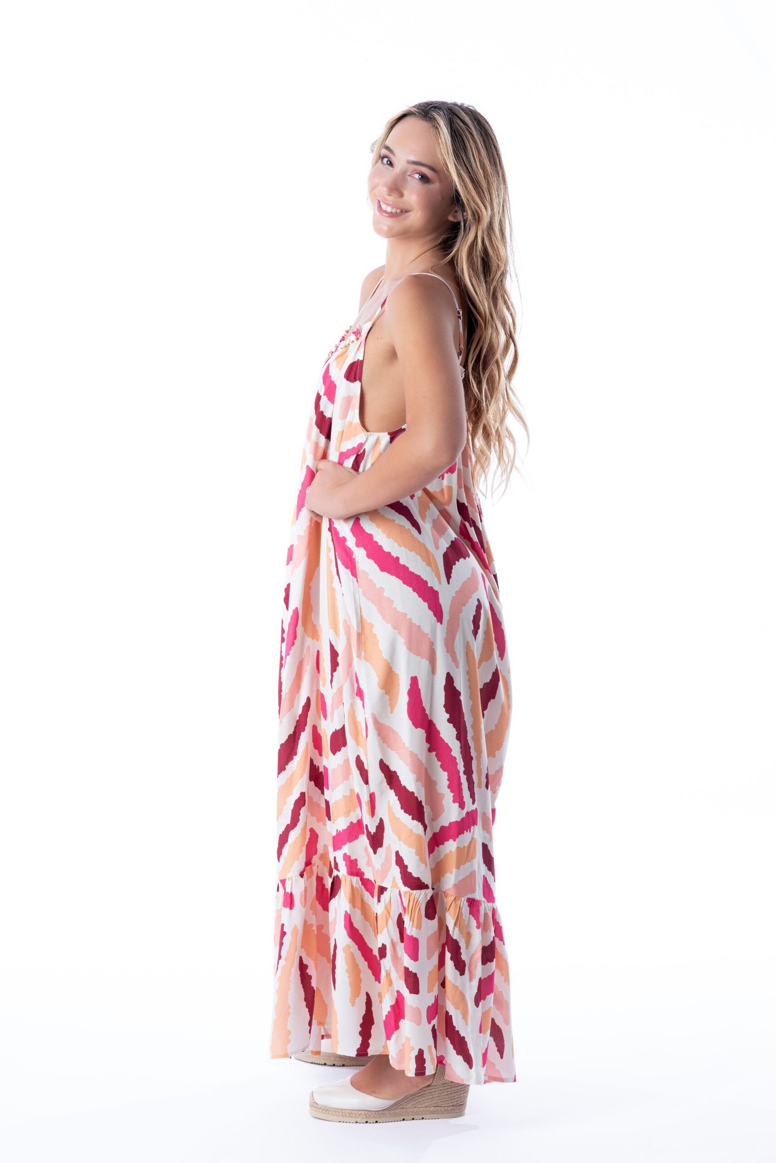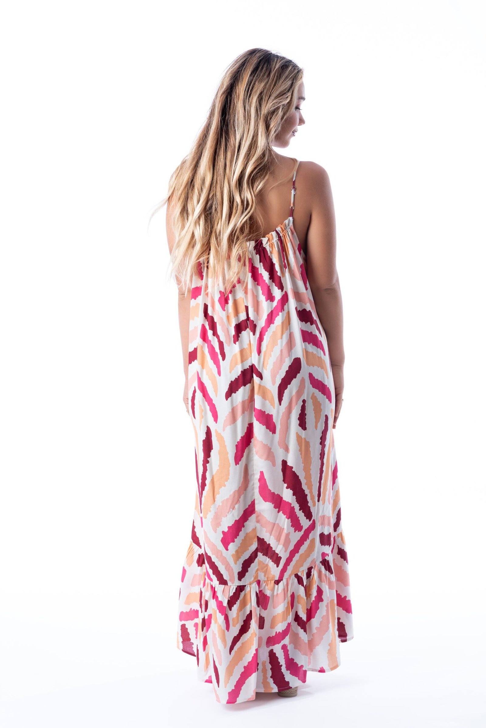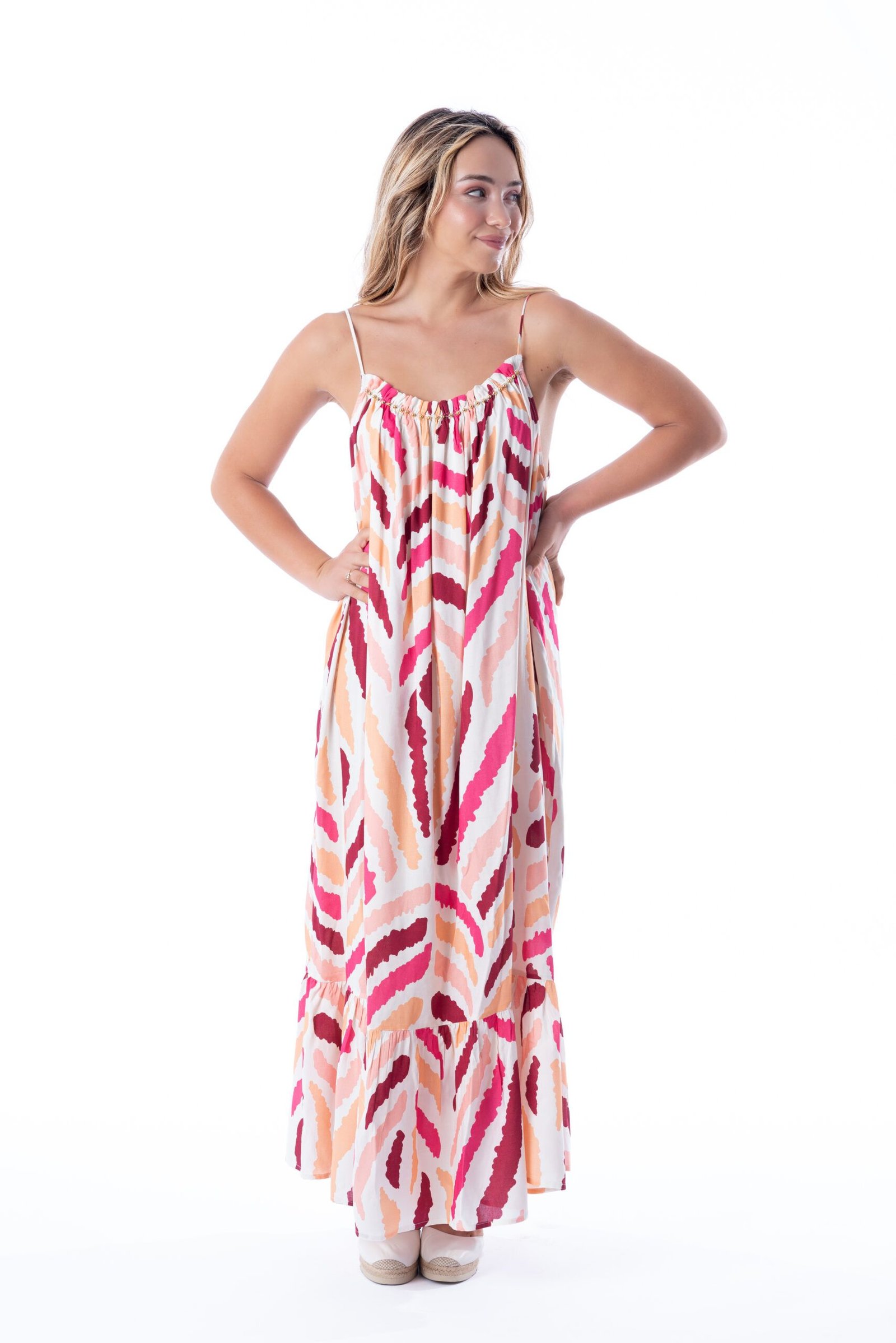 El maxivestido Africa es una sinfonía relajante. Con tirantes ajustables, bajo con volantes y detalle de embellishment en el cuello ofrece una silueta muy relajada que lo convierten en el básico perfecto para el día a día en verano.