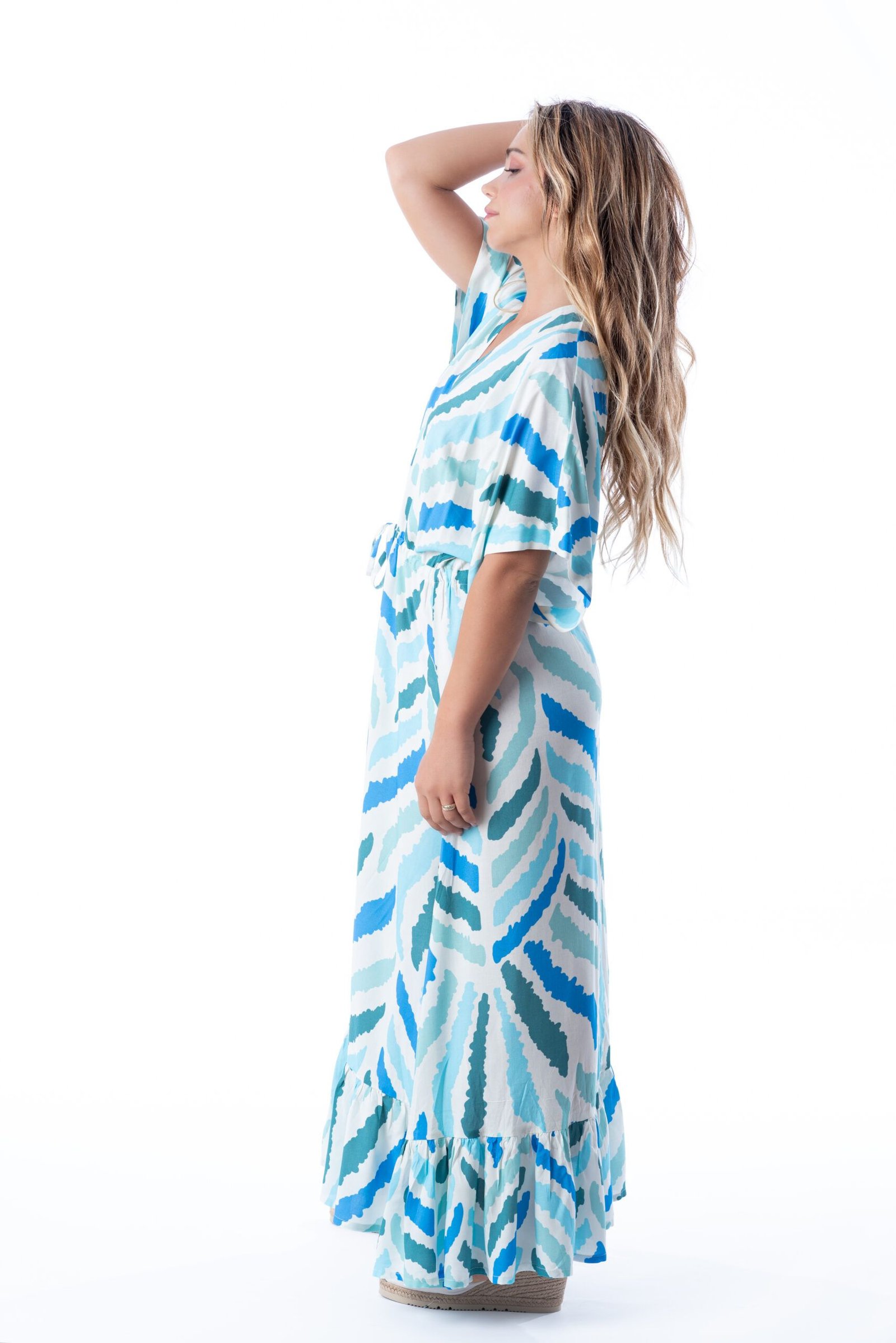 Vestido caftán largo con mangas kimono cortas. Escote en pico delante y detrás. Volante en el bajo del vestido. La cintura se ciñe mediante un lazo corredizo rematado con borlas. El estampado realza el diseño sofisticado.