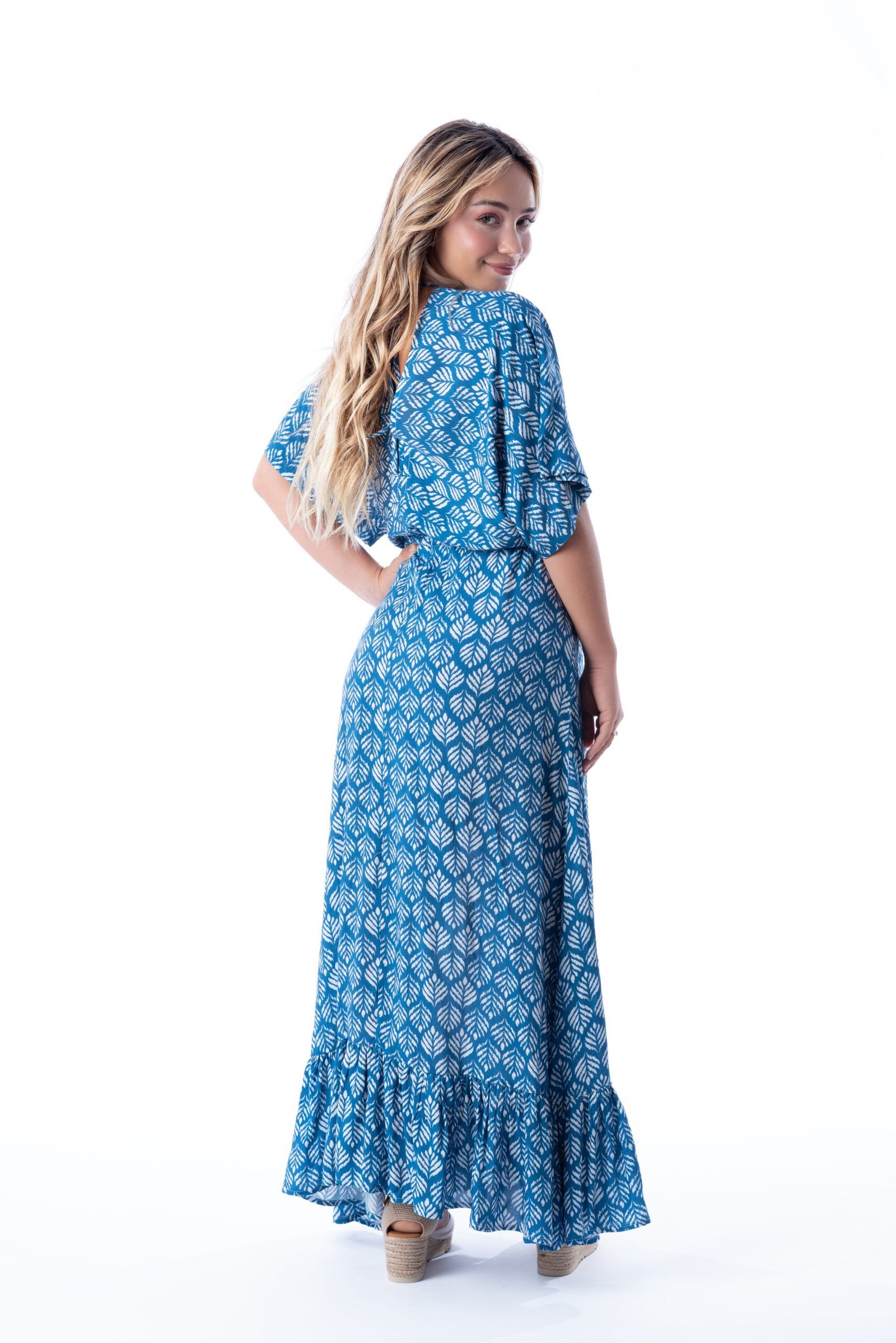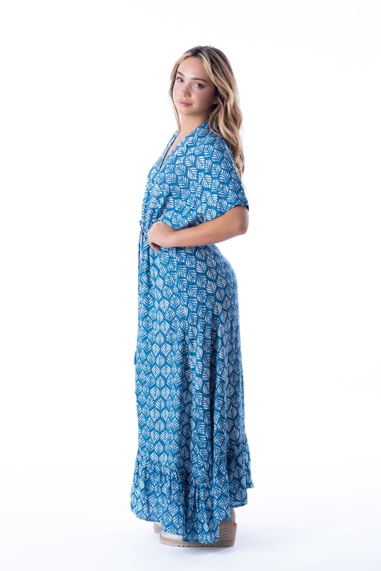 Vestido caftán largo con mangas kimono cortas. Escote en pico delante y detrás. Volante en el bajo del vestido. La cintura se ciñe mediante un lazo corredizo rematado con borlas. El estampado realza el diseño sofisticado.