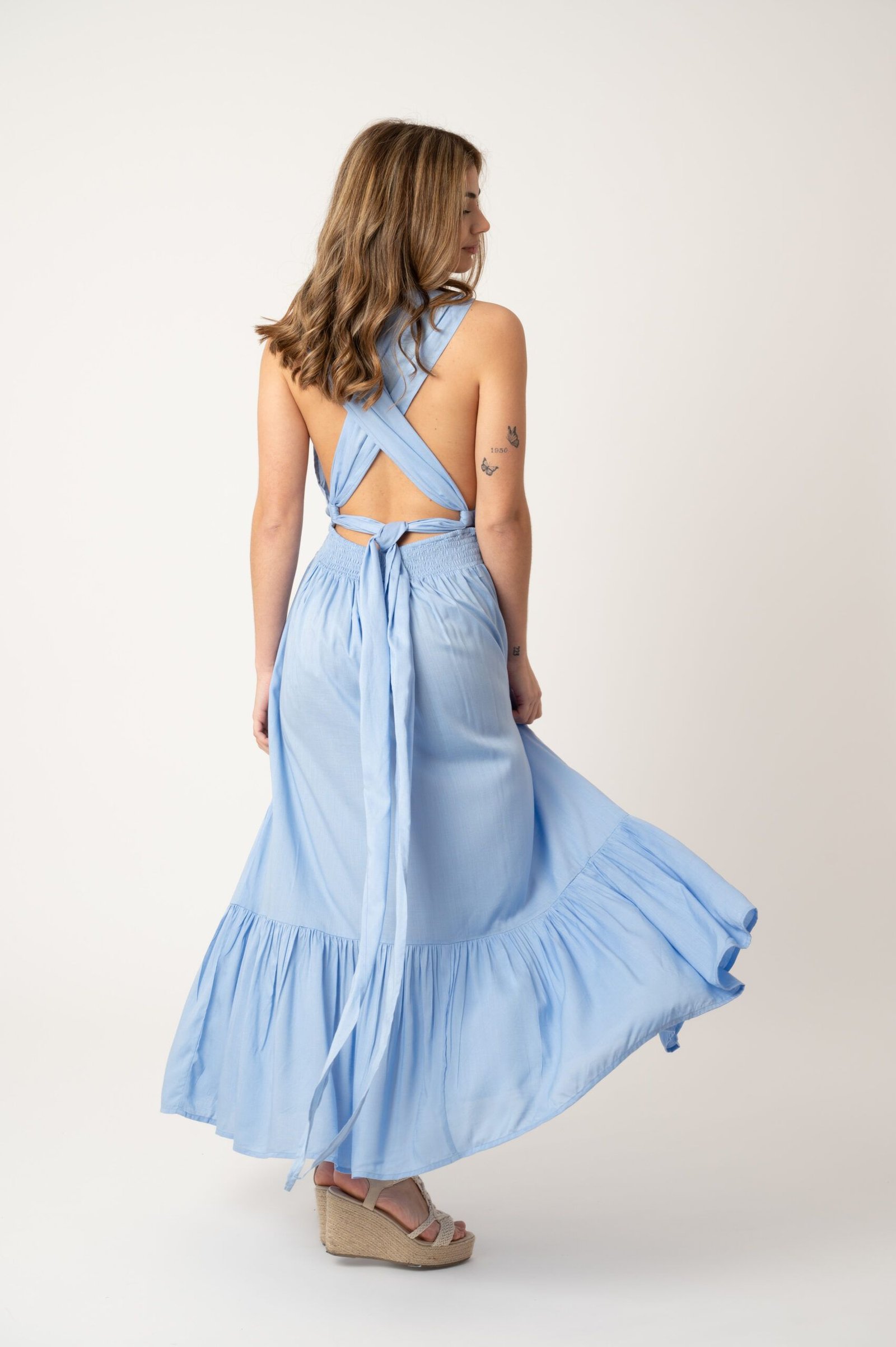 Vestido fluido con escote halter en V. Los lazos que forman el frente le aportan versatilidad para combinar diferentes opciones y crear siluetas estilizadas. Un corte que sorprende a cada paso con la espalda descubierta y la falda envolvente.