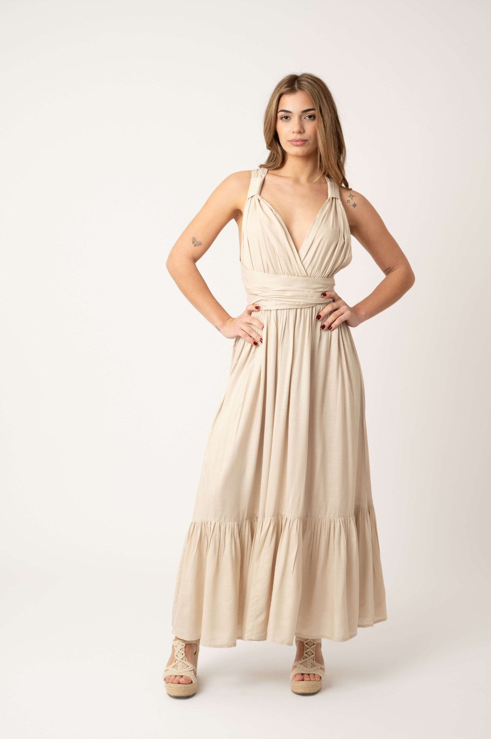 Vestido fluido con escote halter en V. Los lazos que forman el frente le aportan versatilidad para combinar diferentes opciones y crear siluetas estilizadas. Un corte que sorprende a cada paso con la espalda descubierta y la falda envolvente.