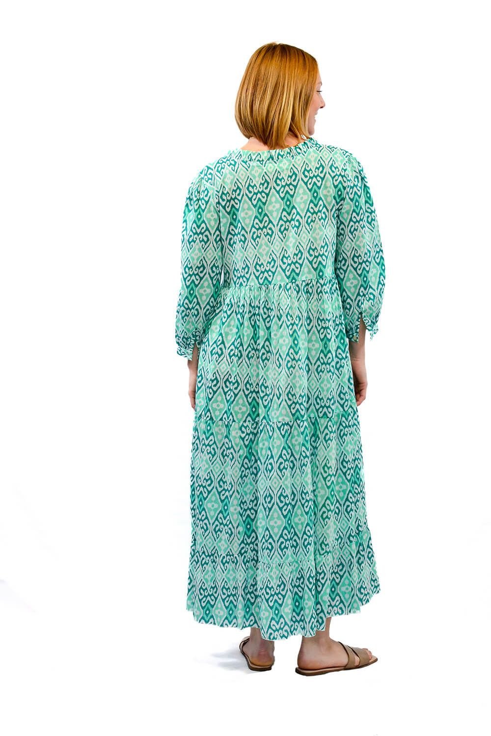 El vestido largo estampado presenta un patrón Ikat distintivo sobre un tejido de
