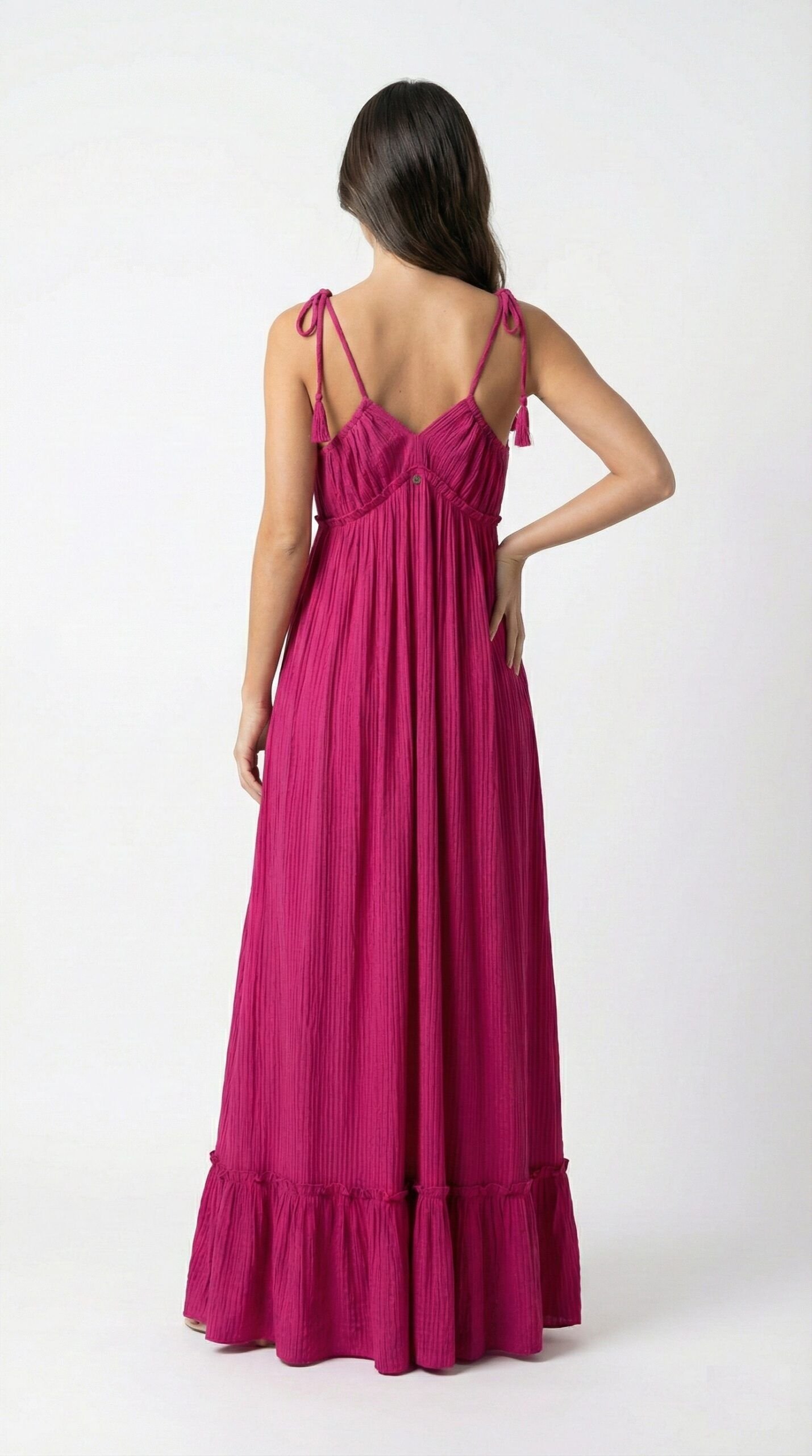 Vestido maxi de estilo boho chic, ideal para los días de sol y aventuras junto al mar. Su diseño realza el escote y los hombros con un toque femenino y moderno. La silueta fluida y liviana se ajusta delicadamente debajo del busto, creando una caída suelta que aporta frescura y movimiento. Perfecto para combinar con sandalias planas o ir descalza por la playa, este vestido es un imprescindible de temporada.