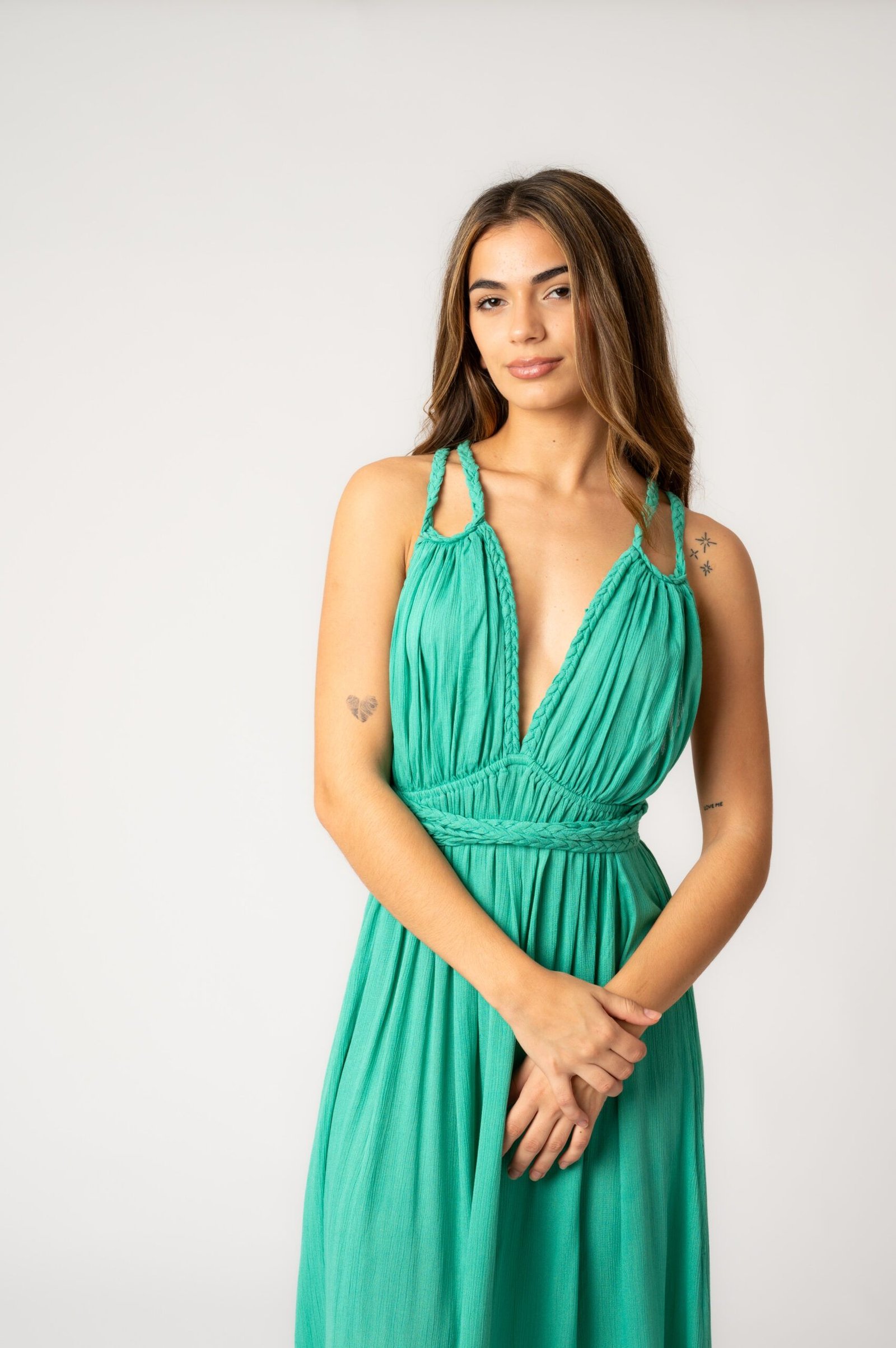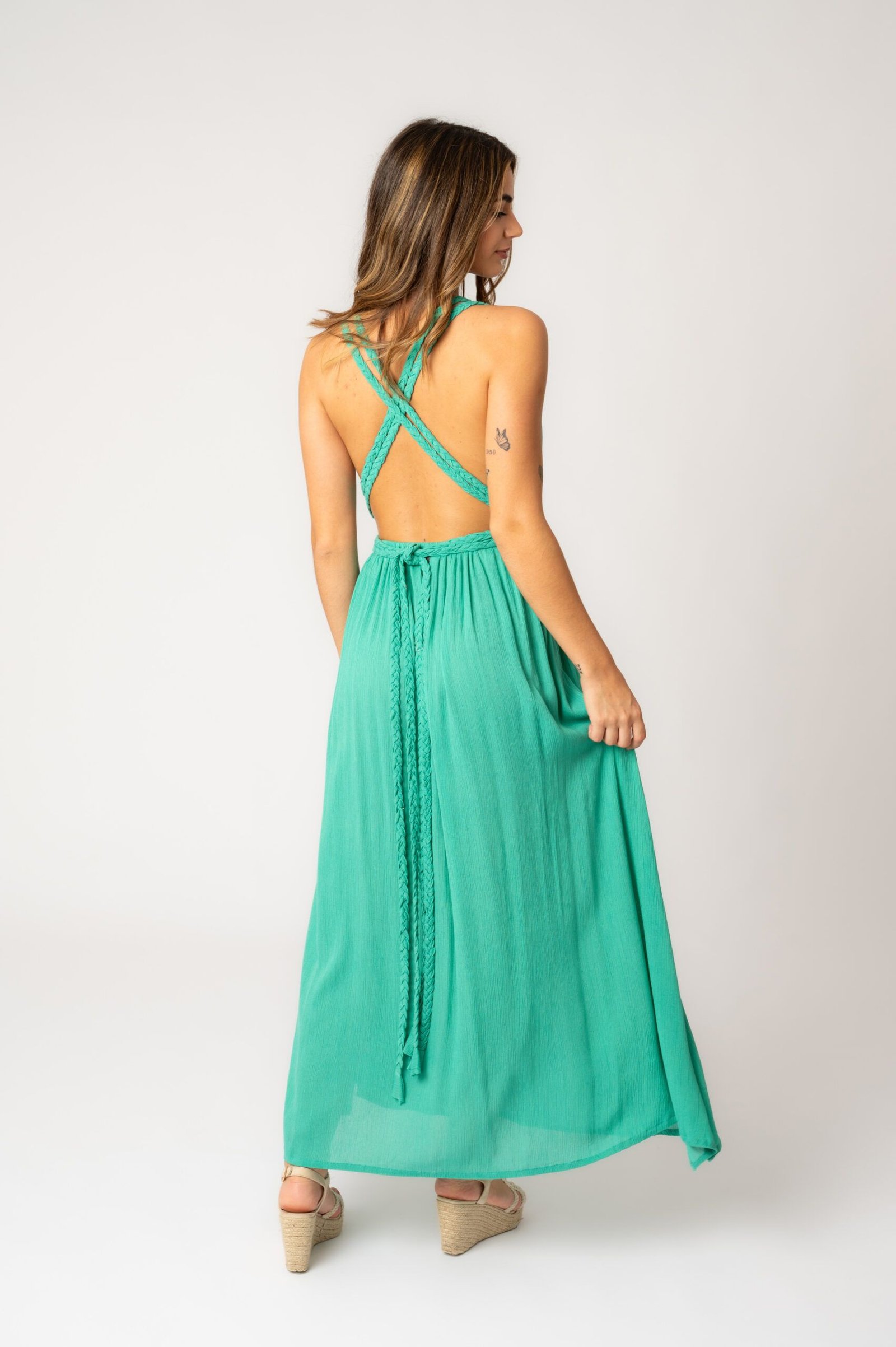 Vestido fluido con escote halter en V. Los lazos trenzados le aportan versatilidad para combinar diferentes opciones y crear siluetas estilizadas. Un corte que sorprende a cada paso con la espalda descubierta y la falda envolvente.