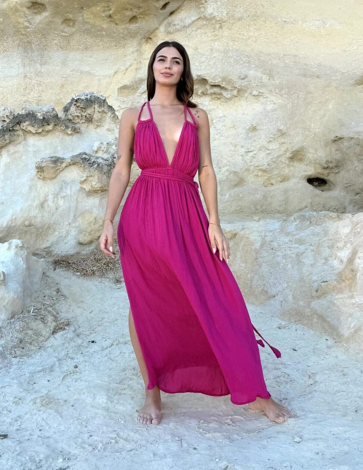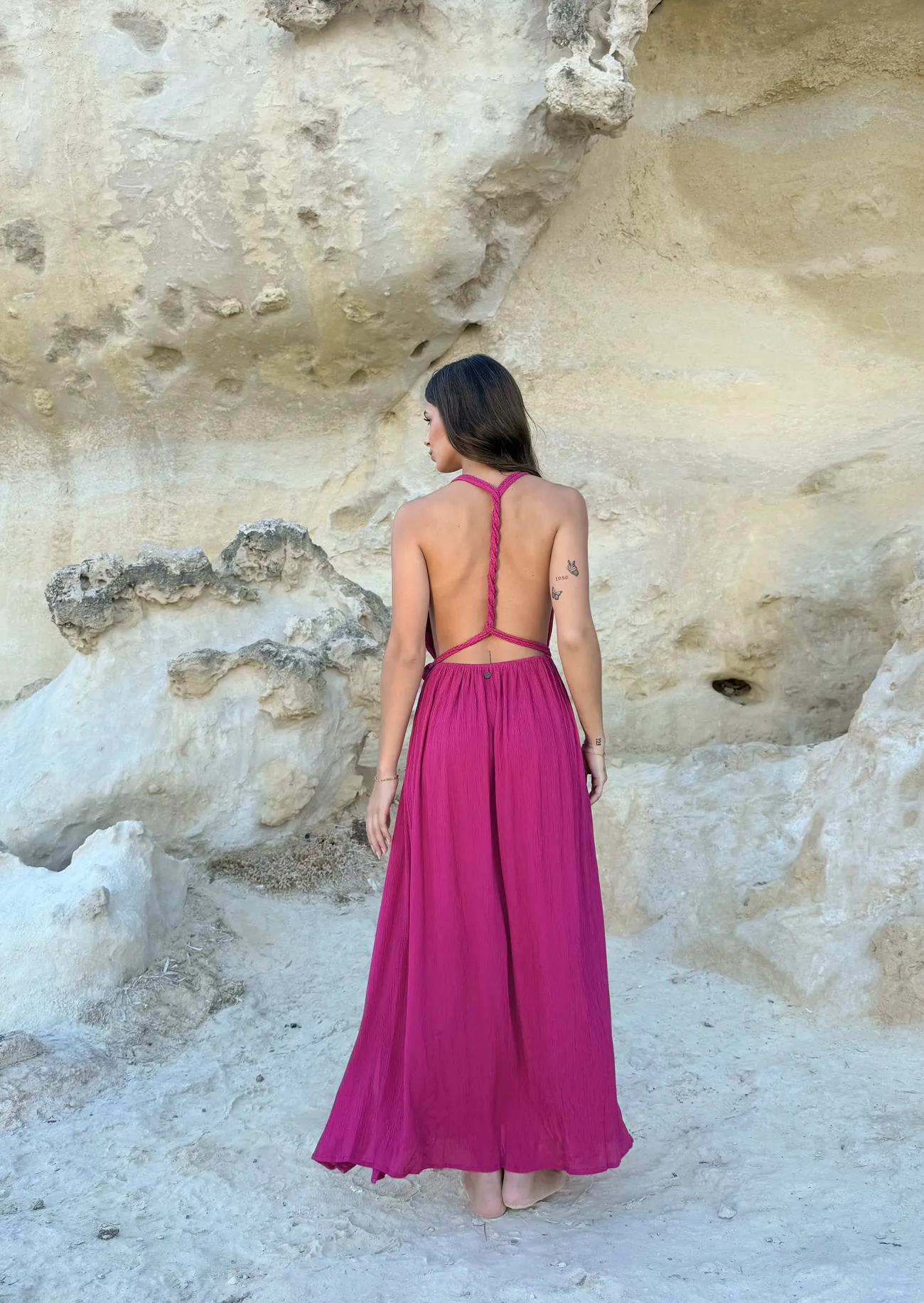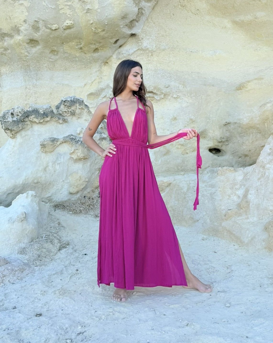 Vestido fluido con escote en «V» y cintura elástica. Los lazos trenzados le aportan versatilidad para combinar varias opciones y crear diferentes siluetas. Un corte que sorprende a cada paso con la espalda descubierta y la falda envolvente. Diseñado en Mallorca fabricado en India. Composición 100% Viscosa Crepe