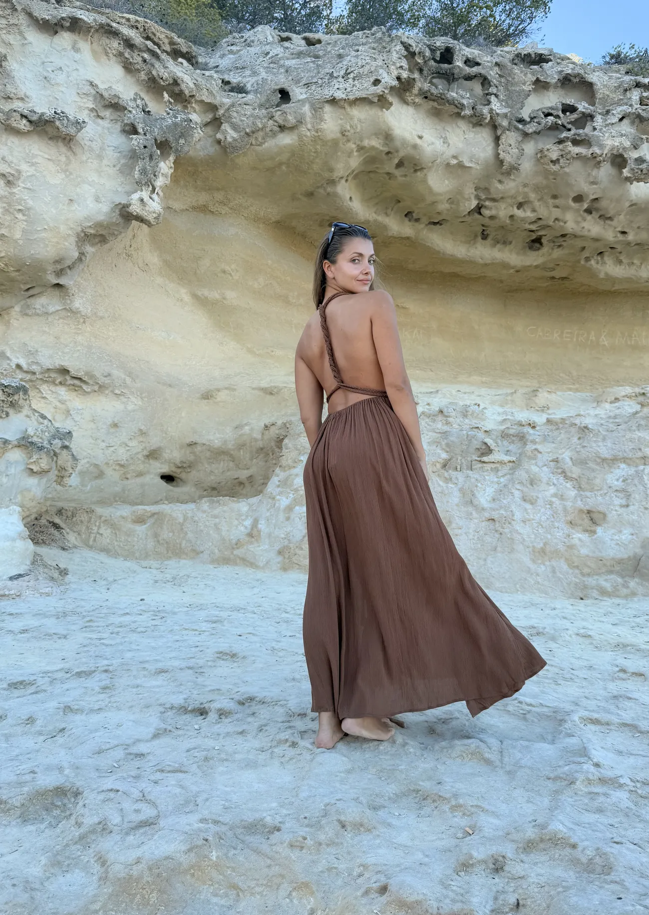 Vestido fluido con escote halter en V. Los lazos trenzados le aportan versatilidad para combinar diferentes opciones y crear siluetas estilizadas. Un corte que sorprende a cada paso con la espalda descubierta y la falda envolvente.