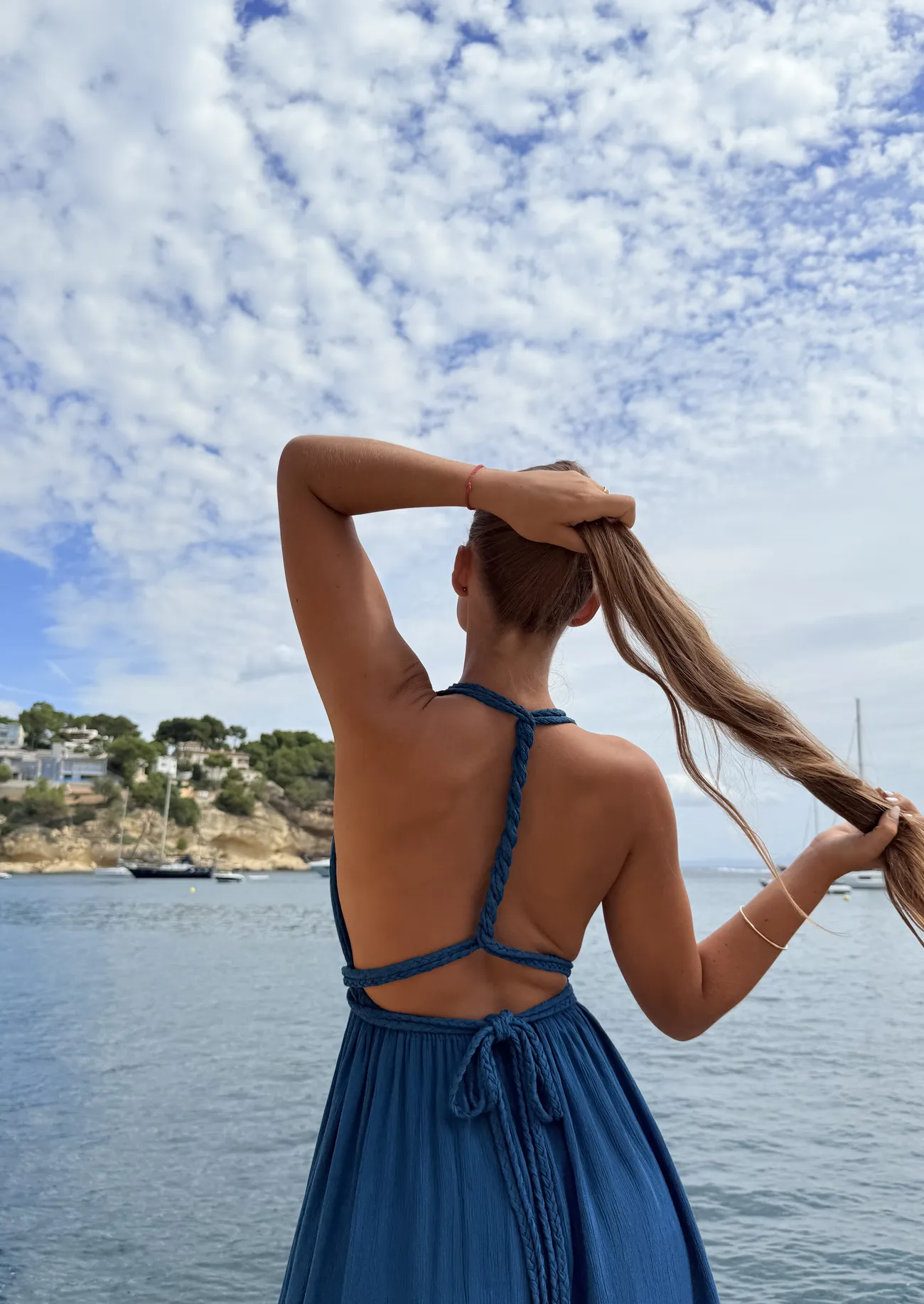 Vestido fluido con escote halter en V. Los lazos trenzados le aportan versatilidad para combinar diferentes opciones y crear siluetas estilizadas. Un corte que sorprende a cada paso con la espalda descubierta y la falda envolvente.