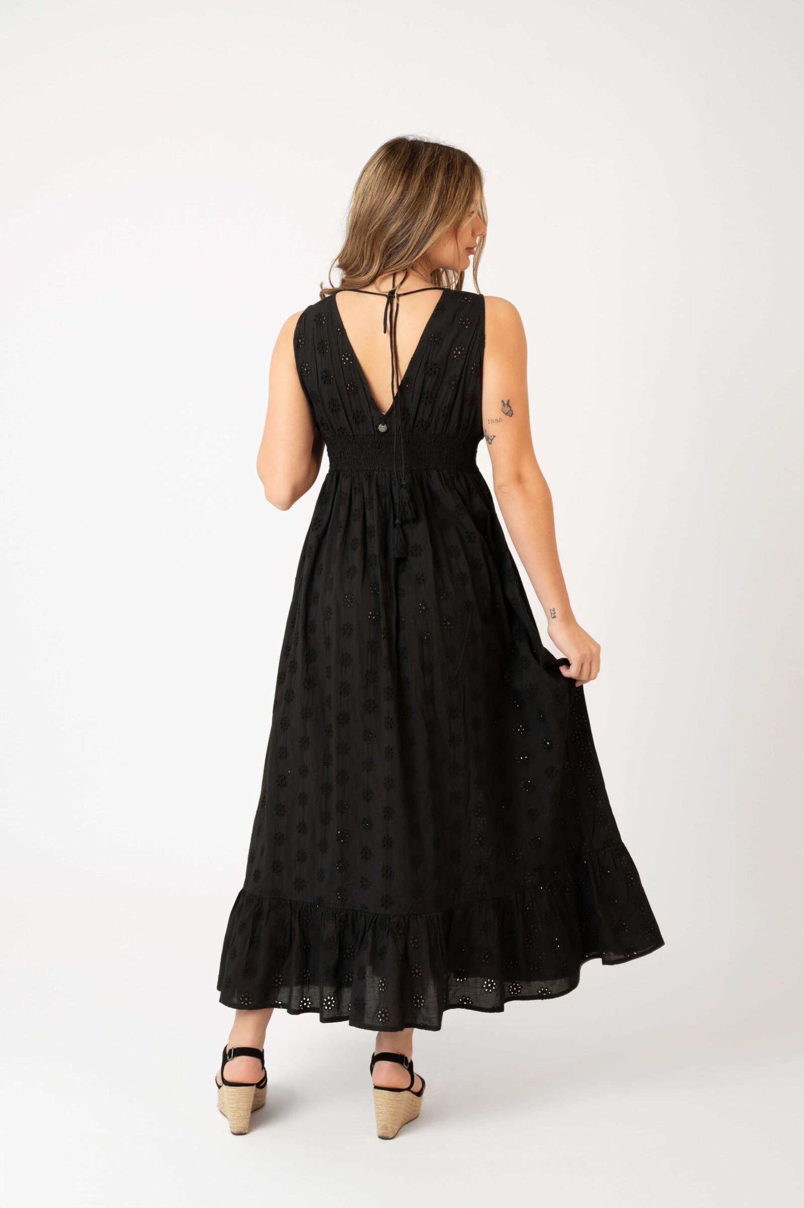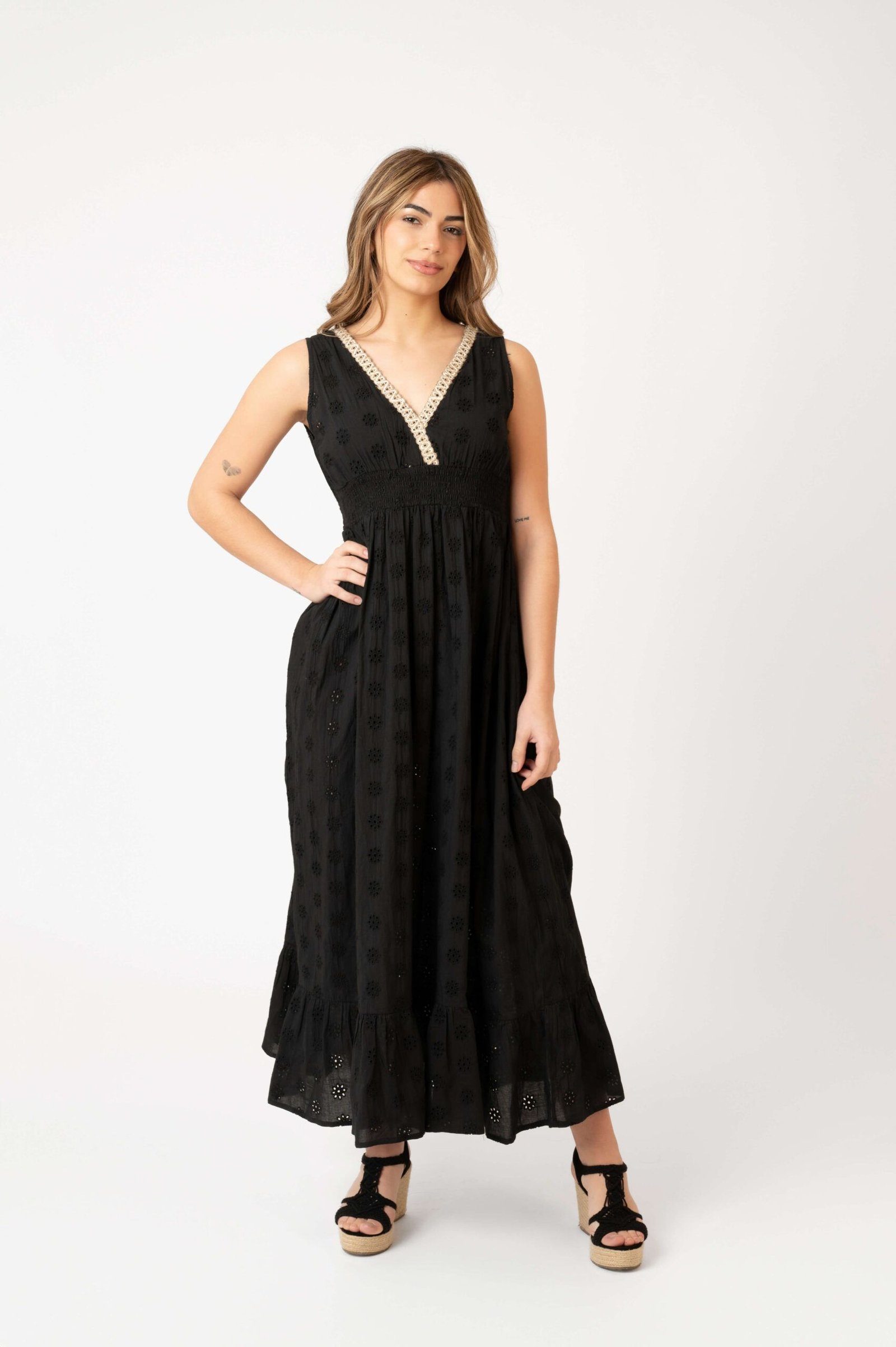 Nuestro icónico vestido JASPREED con el escote en V sigue siendo atemporal. Es largo fluido y con detalles decorativos de jute en el cuello.la falda con frunces se completa con un volante. La ligereza del vestido lo hace un imprescindible en verano. Para estar guapa en todas las ocaciones.