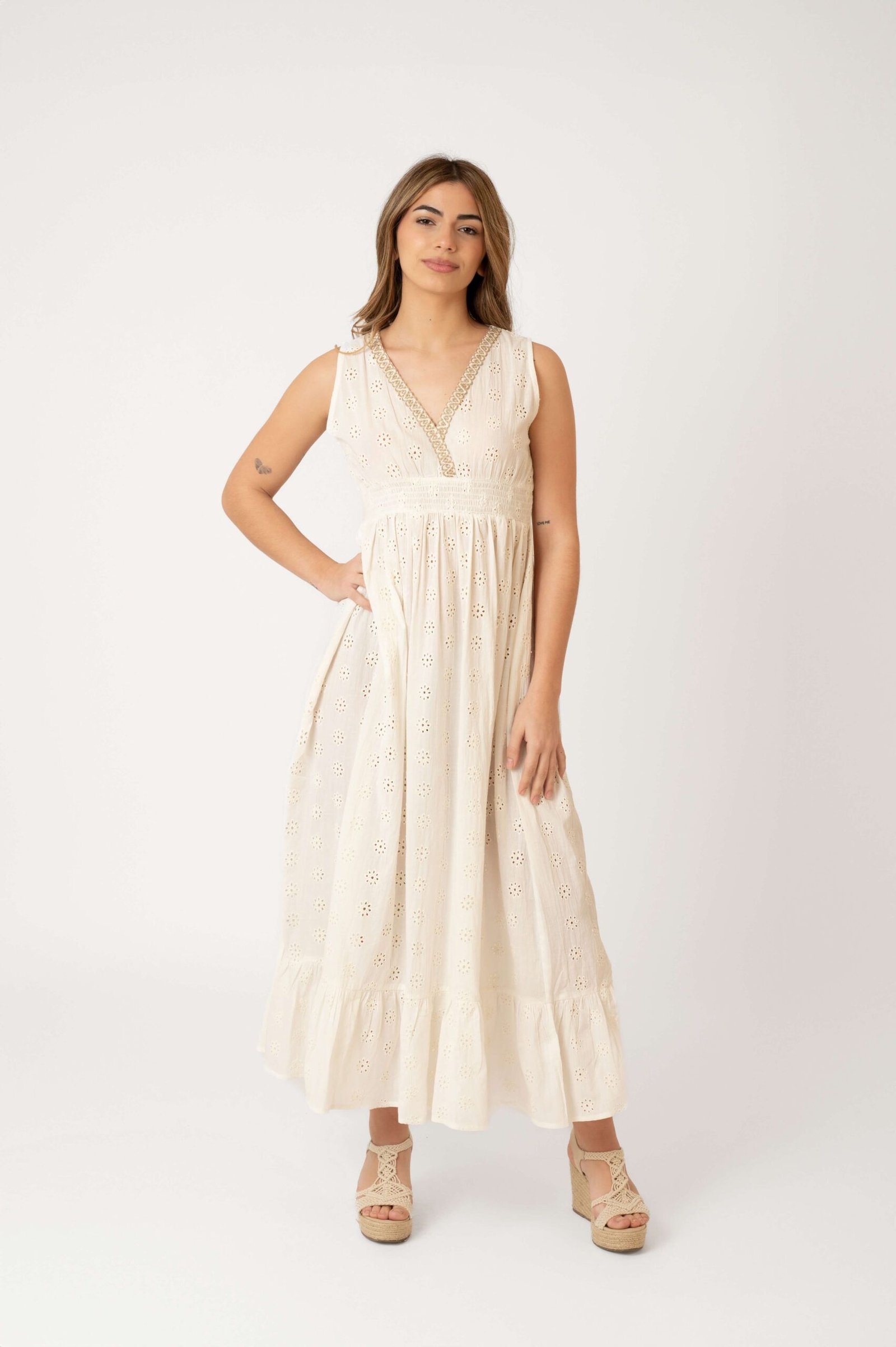 Nuestro icónico vestido JASPREED con el escote en V sigue siendo atemporal. Es largo fluido y con detalles decorativos de jute en el cuello.la falda con frunces se completa con un volante. La ligereza del vestido lo hace un imprescindible en verano. Para estar guapa en todas las ocaciones.