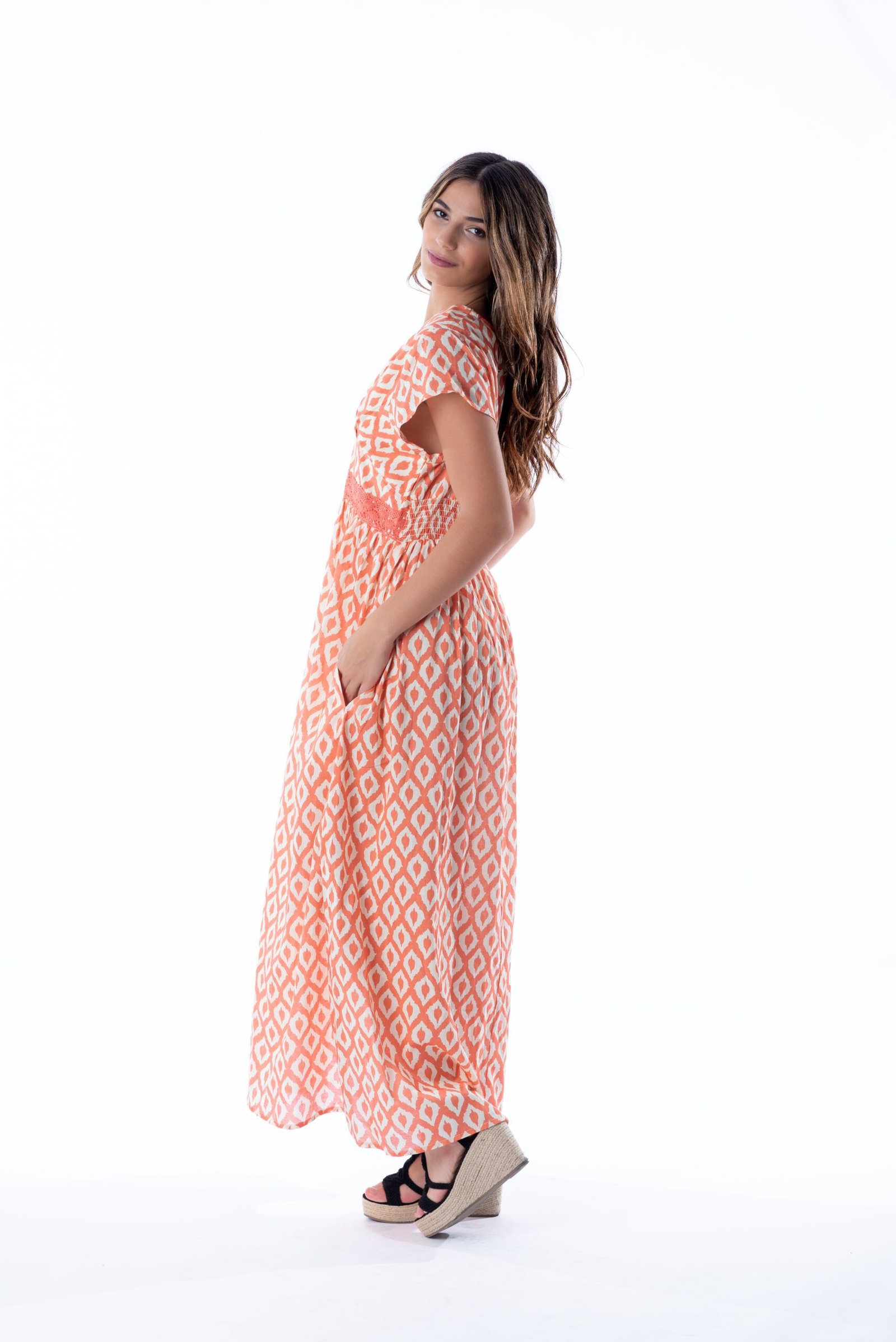 Creado en 100 % Cotton, el vestido Luisa presenta un iconico motivo IKAT. Este vestido de largo midi tiene un corte relajado, espalda con goma y mangas cortas elegantes. El fente está adornado con delicado entredos.