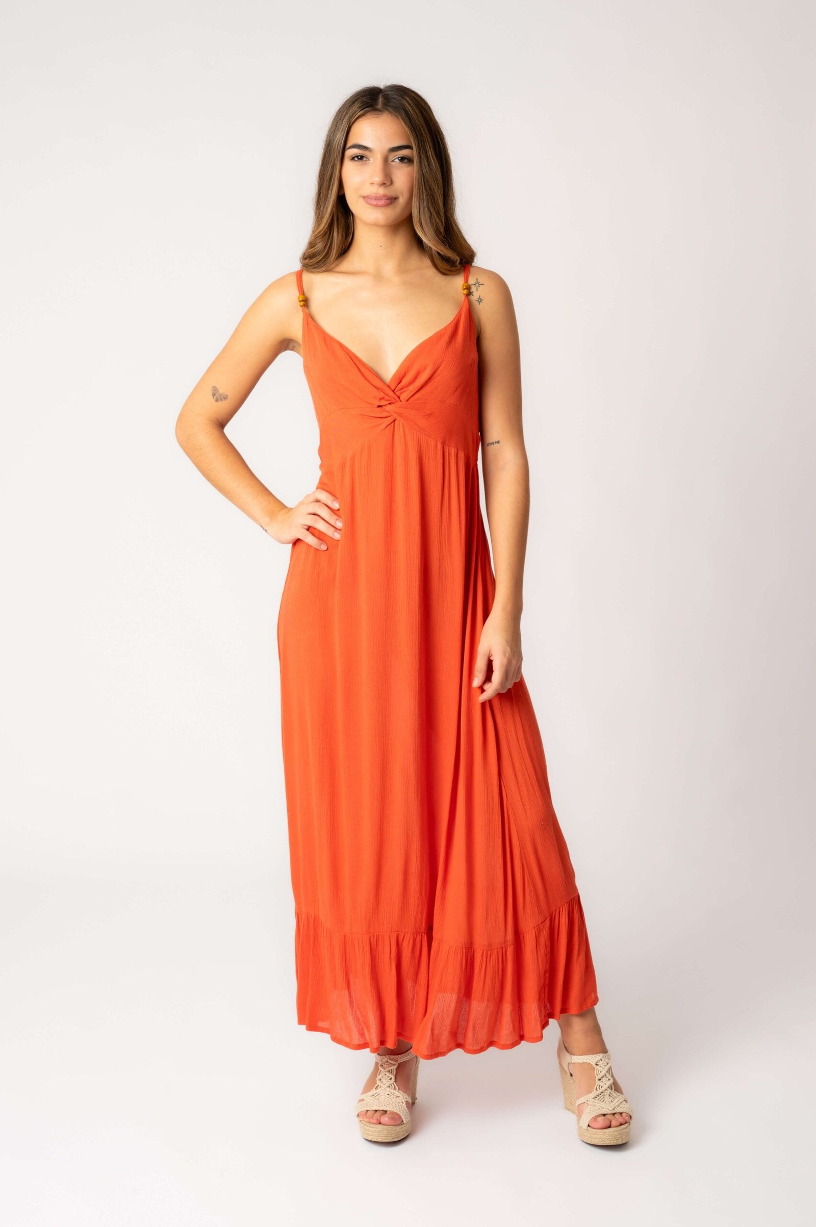 El vestido largo MICA de finos tirantes y panel de busto entrelazado realza el estilo veraniego. El corte fluido y los tirantes regulables con detalle de borlas de madera le aportan un toque rustico y descontracturado para mantener la frescura y lucir moderna y cómoda sin esfuerzo.