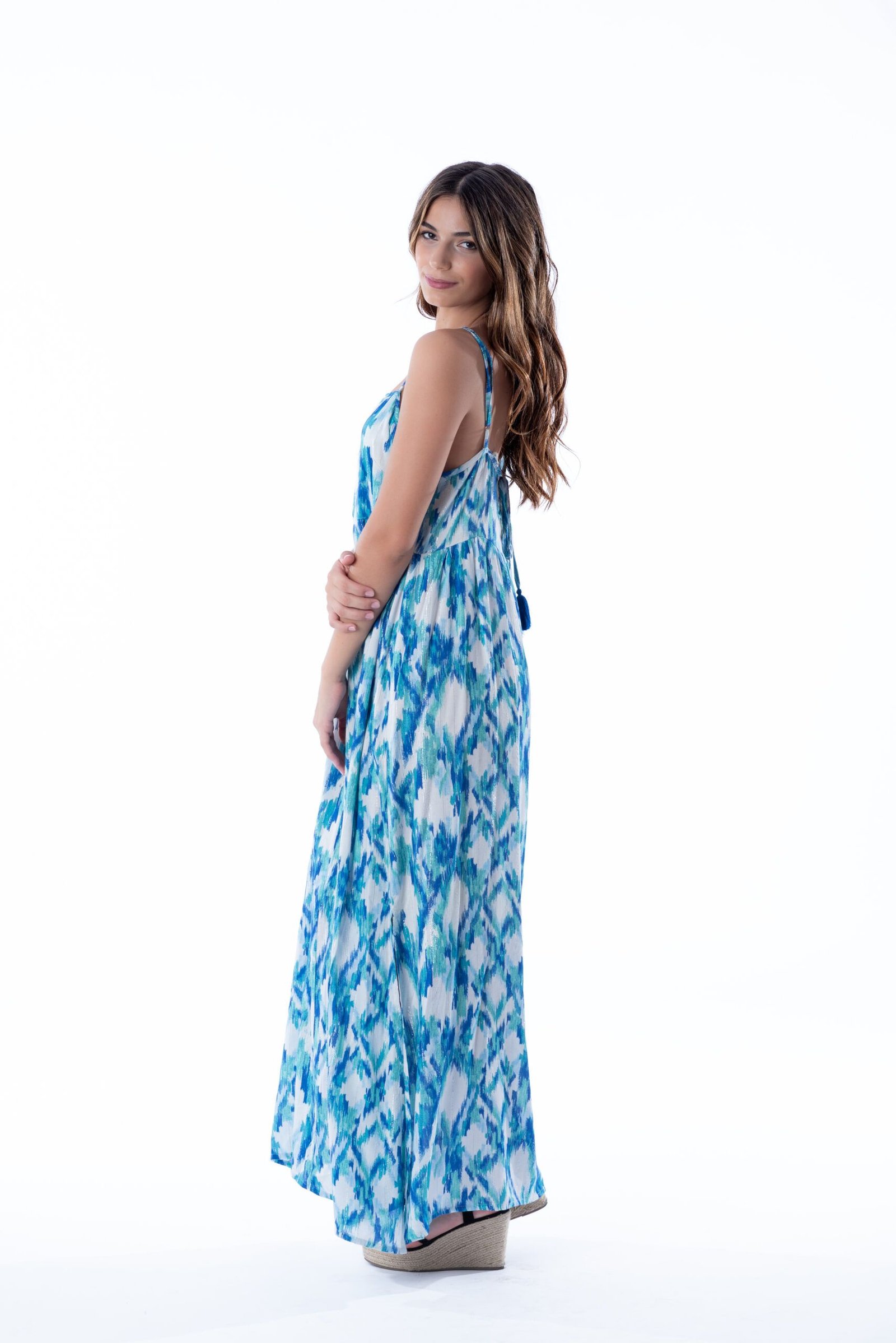 Este impresionante Maxi vestido de tirantes presenta una cautivadora combinación de colores con diseño IKAT exclusivo e hilos plata de Lurex. Evoca los paisajes serenos del entorno Mediterraneo. Con su silueta fluida transmite una sensación de comodidad y elegancia. Perfecto para los calurosos días de verano o escapadas a la playa. Diseñado en Mallorca fabricado en India. Composición 100% Viscosa Lurex