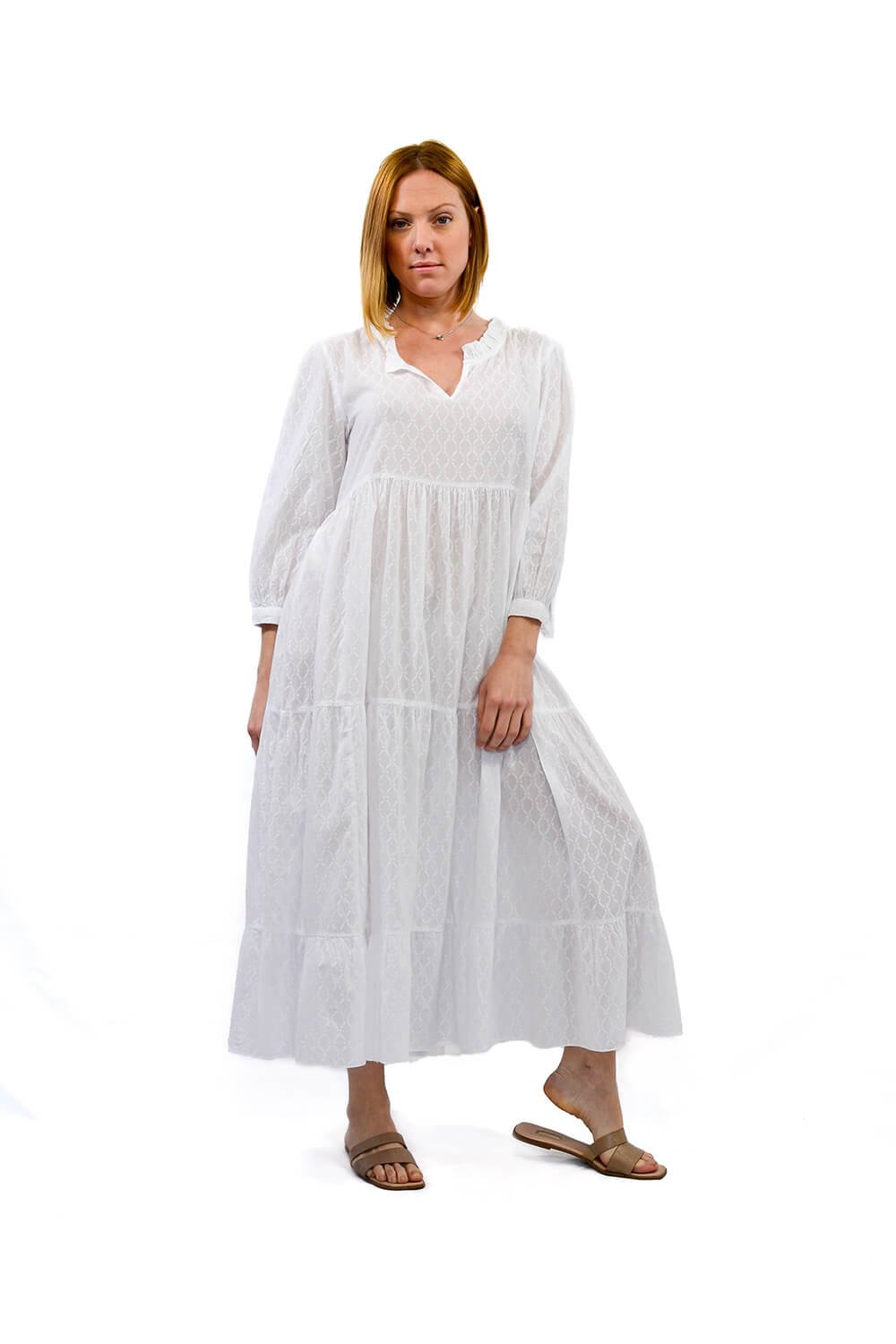 Vestido largo fluido. Cuello redondo con escote V. Manga 3/4. Disponible en estampado IKAT, composición 100% Cotton y sólido blanco, composición 100 % Cotton Doby.