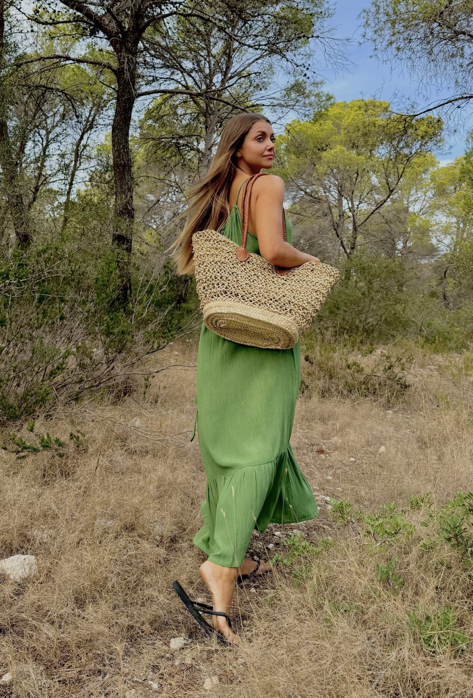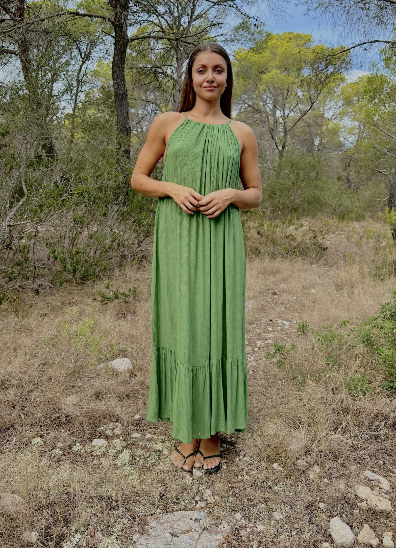 Maxivestido fluido y amplio de escote halter con lazo en el escote de la espalda para fruncir como más te guste. Diseñado en Mallorca fabricado en India. Composición 100% Viscosa Crepe